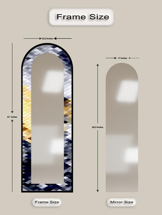 Arch Shaped Floor Mirror with Metal Frame – Gold, Black, or Silver | Leaning, Standing, or Wall-Mounted Full Body Mirror Add artistic charm and functional elegance to your space with our Arch Full Length Mirror, designed to make a bold statement in any room. Whether styled in a bedroom, hallway, or living room, this arched floor mirror enhances your interior with timeless beauty. The edges of the mirror consist of pictures in the colors of your choice printed on tempered glass using the UV printing technique. The mirror itself is mounted on top of this printed tempered glass, giving it a vibrant, durable, and luxurious finish that stands out in any setting. Measurements; TOTAL SIZE (Uv Printed Tempered Glass + Mirror) : 23,5’’W x 67’’ H ONLY MIRROR SIZE : 17’’W x 60,5’’ H Choose from three premium frame finishes—Arch gold mirror, sleek black, or arch floor mirror silver—and enjoy flexible use as a Standing Floor Mirror, Arched Wall Mirror, or casually leaned for a designer look. This is more than a Full Body Floor Mirror with Stand—it’s a piece of functional art. Multiple Placement Methods, This arched floor mirror comes with a U-shaped bracket, which you can freely place in the living room or bedroom. For your convenience in hanging on the wall, special hangers are designed on the back of the mirror.Our premium mirrors are crafted by gluing 4mm tempered glass to a 4mm mirror, combining durability and style. The tempered glass features UV printing for a glossy, vibrant look, while both the glass and mirror have smooth, grinded edges for safety. The hidden metal hanger ensures a sleek, ready-to-hang design, making it an elegant and functional addition to any room.