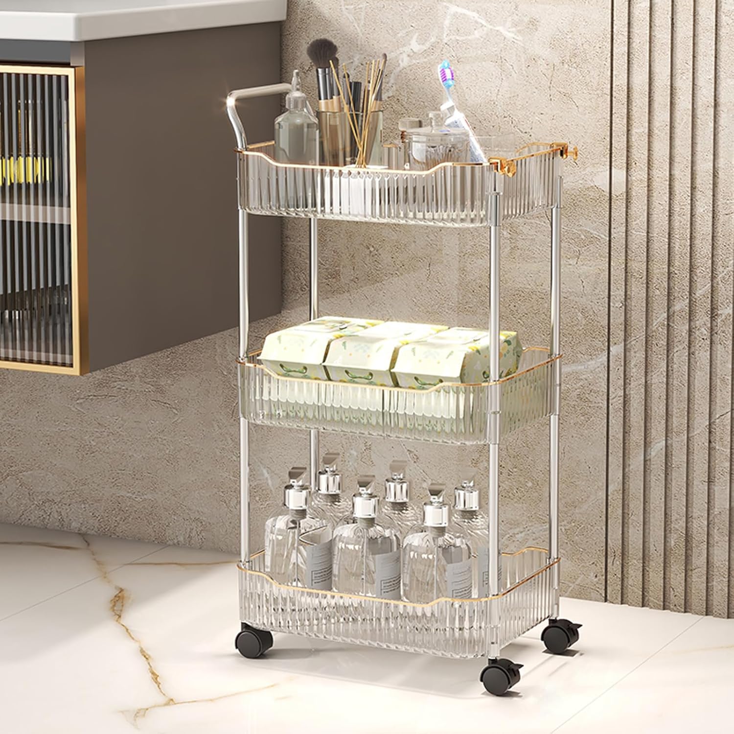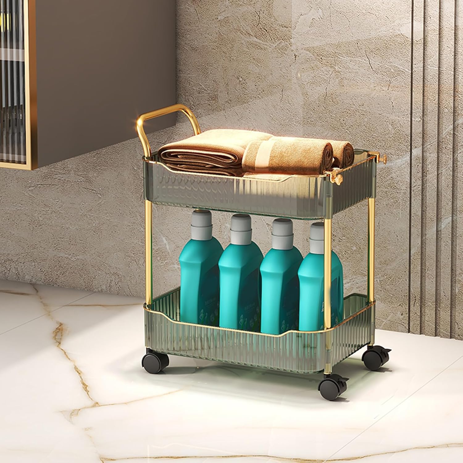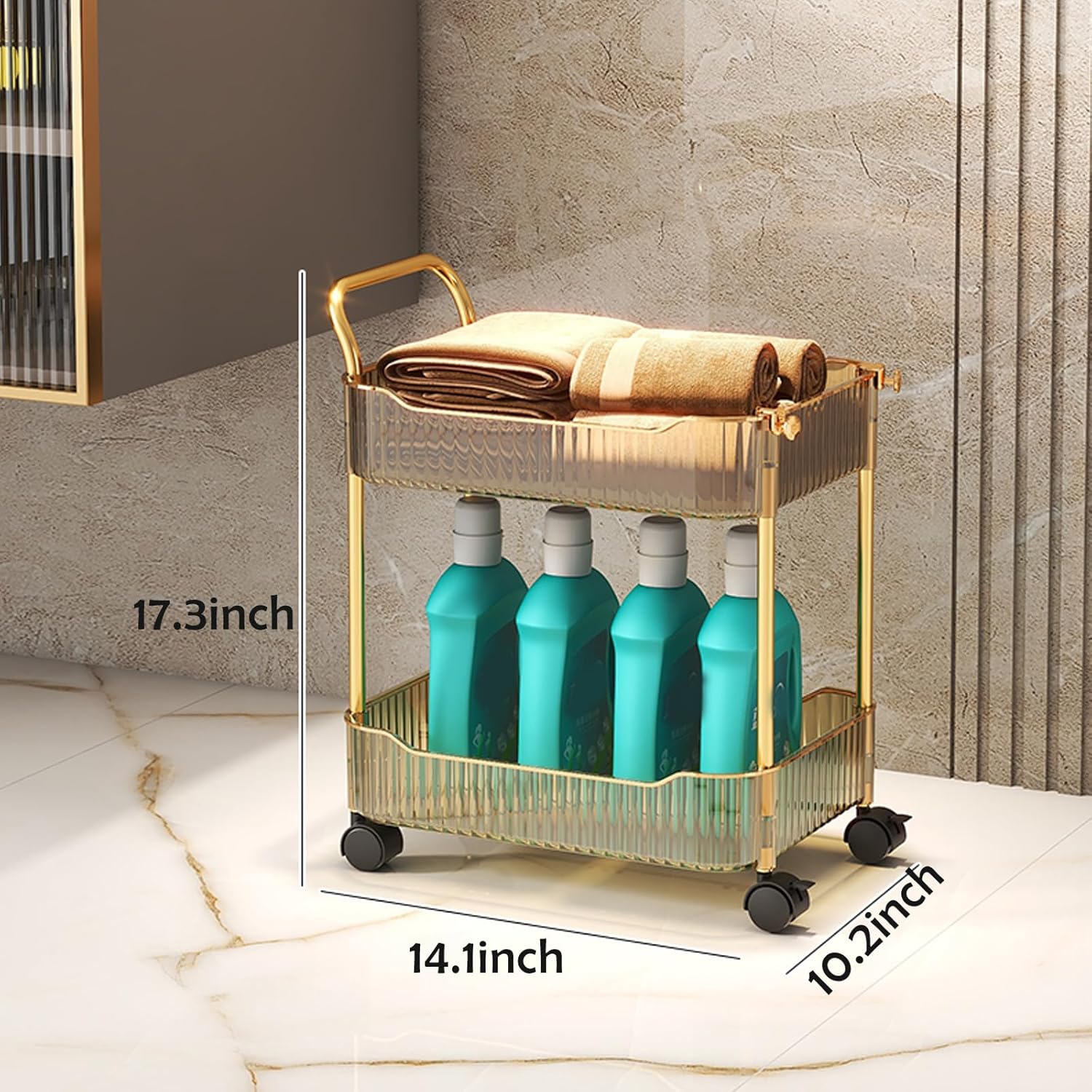Material: AcrylicFrame Material: Stainless steelsColor: Clear, Gold, GreenNumber of Shelves: 2 Tier,3 Tier, 4 TierAssembly Required: Yes2 Tier Size: 14.1*10.2*17.3inch(L*W*H) 3 Tier Size: 14.1*10.2*27.1inch(L*W*H) 4 Tier Size: 14.1*10.2*37.4inch(L*W*H)Acrylic storage trolley with 360-degree universal swivel wheels, thickened stainless steel support frame, solid structure, strong load-bearing capacity. Flexible for multi-scene, bedroom, kitchen, bathroom, living room, office, etc. Portable storage new choice, make your life neat and clear. This multifunctional rolling storage trolley can be used anywhere you want such as bathroom, kitchen, office, laundry rooms, salon, garden, garages, hobby and craft areas and so on. The top shelf of the storage trolley is designed with hooks for hanging small objects. Ergonomic armrests make it easy to move the trolley to any position. Highly transparent material with gold-rimmed baskets to add texture to your home. Diverts water to the drainage holes and removes it from the drainage holes. Acrylic Storage Trolley, Bathroom Kitchen Rolling Utility Cart Mobile Organization Shelves with Handle And Lockable Wheel,Gold,4TierThank you for choosing us, we will provide you with the best quality and the most sincere service. If you encounter any problems please contact us and we will reply to you within 48 hours.
