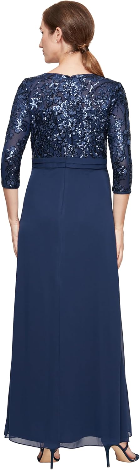 Celebrate your loved one's special day in timeless elegance with the Alex Evenings Women's Long Mother of the Bride Dress. This sophisticated formal gown combines a flattering empire waist with a luxurious stretch sequin lace bodice, creating the perfect balance of comfort and glamour. The V-neckline frames your face beautifully while the 3/4 sleeves provide ideal coverage for any season. The soft, flowing chiffon skirt with cascade detail moves gracefully as you dance the night away, while the A-line silhouette flatters all figures. Designed with your comfort in mind, this dress is fully bra-friendly and constructed to provide support throughout long celebrations. Perfect for mother of the bride or groom, evening weddings, formal galas, black-tie events, and special occasions