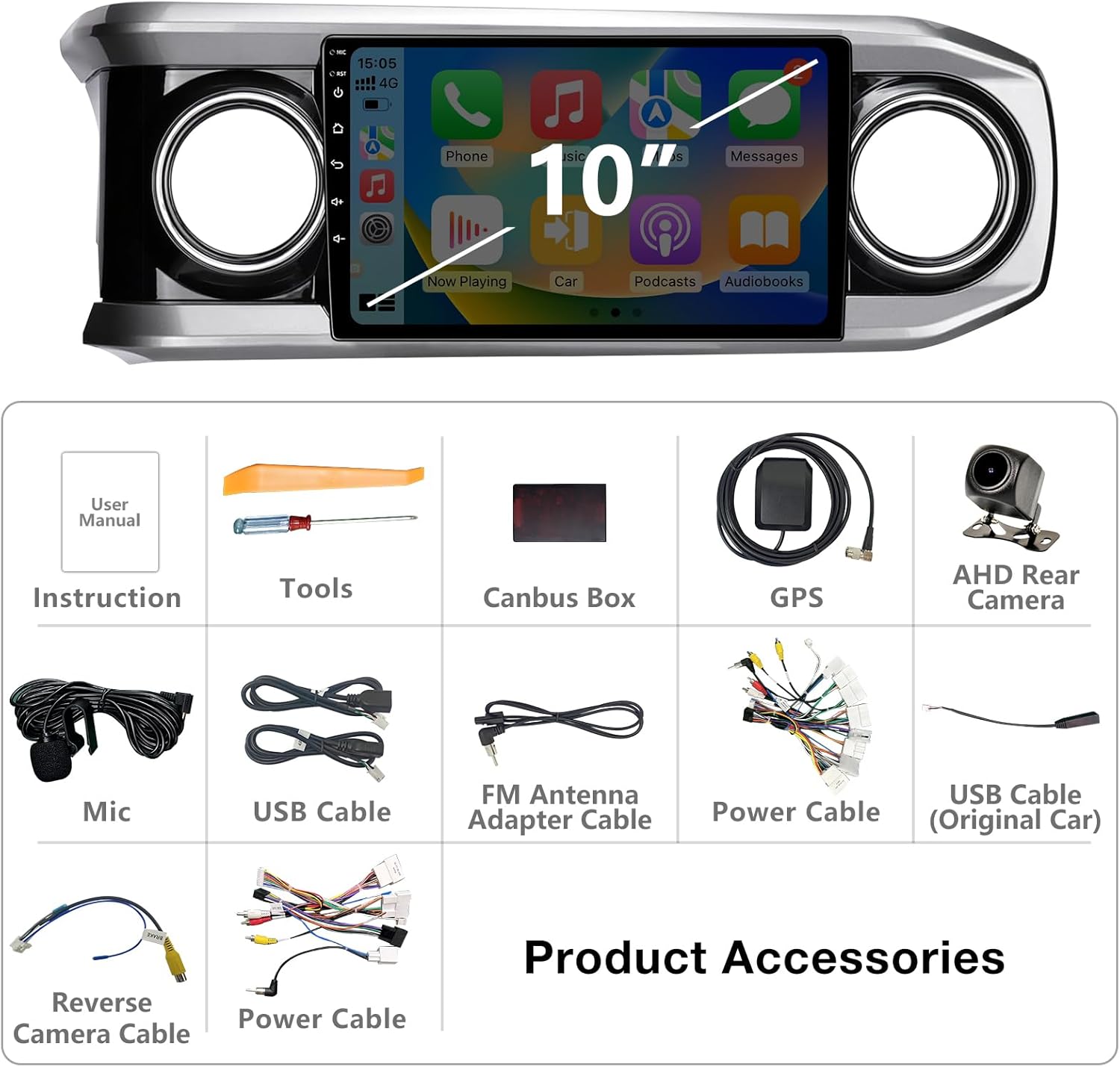 | BuiltIn Media | Radio Body, GPS Antenna, External Mic, Power Cable Harness, RCA Cable Harness |