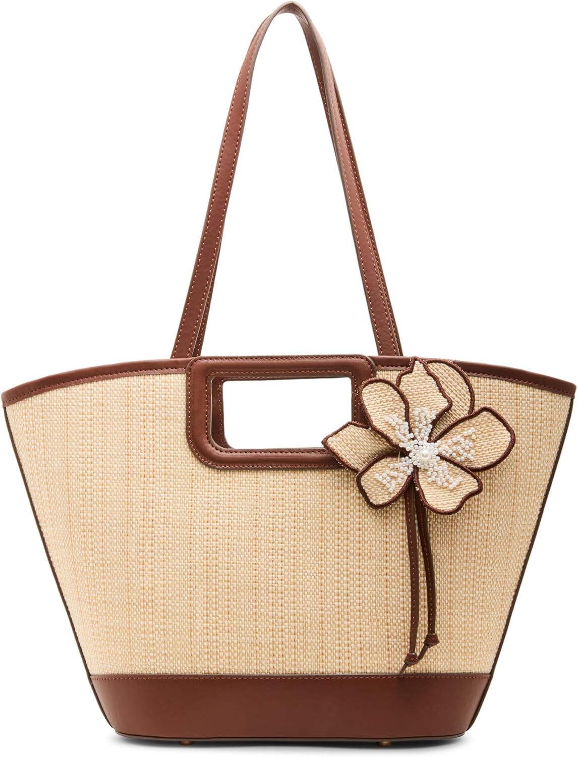 Elevate your style with this chic flower tote! Perfect for casual outings or on the go. It's spacious and will fit your cellular device, keys, wallet and more. Features a 3D pearl flower and has minimal branding.