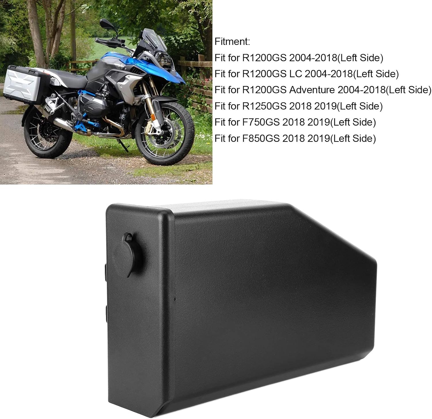 Specification: Item Type: Motorcycle Tool Box Material: ABS Color: Black Installation Position: Left side of the rear seat Fitment: Fit for R1200GS 2004-2018(Left Side) Fit for R1200GS LC 2004-2018(Left Side) Fit for R1200GS 2004-2018(Left Side) Fit for R1250GS 2018 2019(Left Side) Fit for F750GS 2018 2019(Left Side) Fit for F850GS 2018 2019(Left Side) Package List: 1 Box 2 x Keys 1 x Glue 1 Pack of Screw Accessories