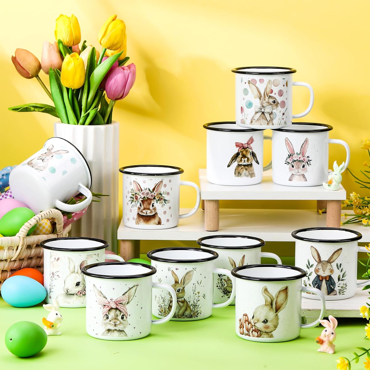 Features: These Easter bunny coffee mugs are the ideal addition for any themed parties. They are especially useful for celebrating the spirit of Easter, adding an exclusive touch to your gathering while serving your favorite drinks. The set of 12 Easter mugs effectively meets your needs in any setting, may it be a family gathering or a grand party. The different designs can help people distinguish their cups and the adorable Easter bunny design is sure to be a hit among everyone, making them standout assets in your kitchen or party decor. Specifications: Material: enamel Color: as picture shown Size: approx. 350 ml/ 12 oz in capacity Package includes: 12 x Easter mugs Notes: Manual measurement, please allow slight errors on size. The color may exist a slight difference due to different screen displays.