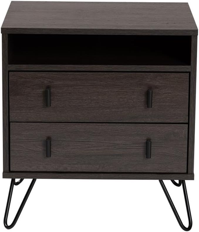 Bring modern convenience to your bedside with the handy Glover nightstand. Made in Malaysia, the Glover is constructed from sturdy wood showcasing a rich dark brown finish. Two wide drawers provide concealed storage, while an open shelf and rectangular tabletop allow for easy organization of bedside essentials and decorations. Requiring assembly, the Glover is fitted with black tone metal legs for excellent stability and a cool, modern look. Long rectangular black drawer handles add minimalist charm, making the Glover nightstand a chic addition to any space.Features:- Constructed from metal and engineered wood- Dark brown finish- Two (2) drawers with open shelf- Black finished polymer drawer handles- black finished metal hairpin legs- Assembly required- Made in MalaysiaSpecifications:- Product Dimensions: 21.7" High x 19.7" Wide x 15.7" Deep; Drawer: 2.3" High x 16.2" Wide x 12.5" Deep; Shelf: 3.1" High x 18.3" Wide x 15.5" Deep; Legs: 5.5" High;