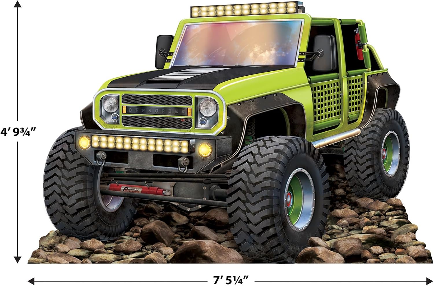 Beistle Off-Road Truck Stand-UpProudly Made in the USAGear up for adventure with the Beistle Green Off-Road Truck Stand-Up, a bold and life-sized decoration that will excite off-road enthusiasts and party guests alike. Measuring 4 feet 8 inches wide by 3 feet 0.5 inches tall, this rugged stand-up is made from durable corrugated cardboard and features an attached easel for stability. Designed with vibrant green colors and realistic details, it replicates the look of a high-powered 4x4 truck tackling rocky terrain. Perfect for safari-themed birthdays, jungle parties, dinosaur events, or automotive shows, this eye-catching prop transforms your space into an action-packed adventure. Use it as a stunning centerpiece, a thrilling photo booth backdrop, or a unique decoration that sparks the spirit of exploration. Easy to assemble and built to impress, this off-road truck stand-up is the ultimate party accessory for adventurous celebrations.