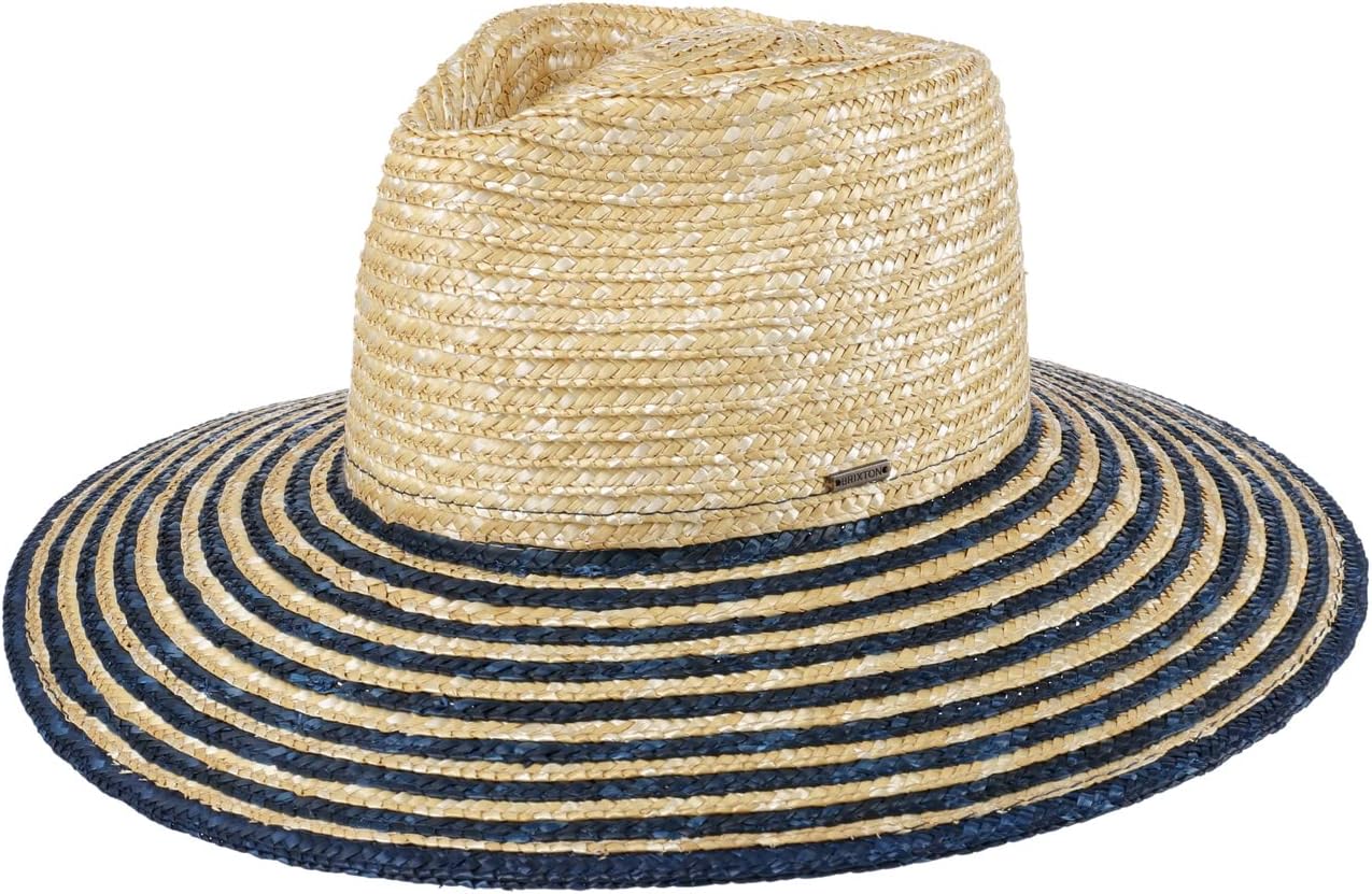 One of our favorite silhouettes fashioned for festivals. The Joanna is a wheat straw hat woven with light stiffness. This version has been updated with unique, colorblock straw. A wide brim adds extra sun protection on all sides, making this a must for blue sky soirées.