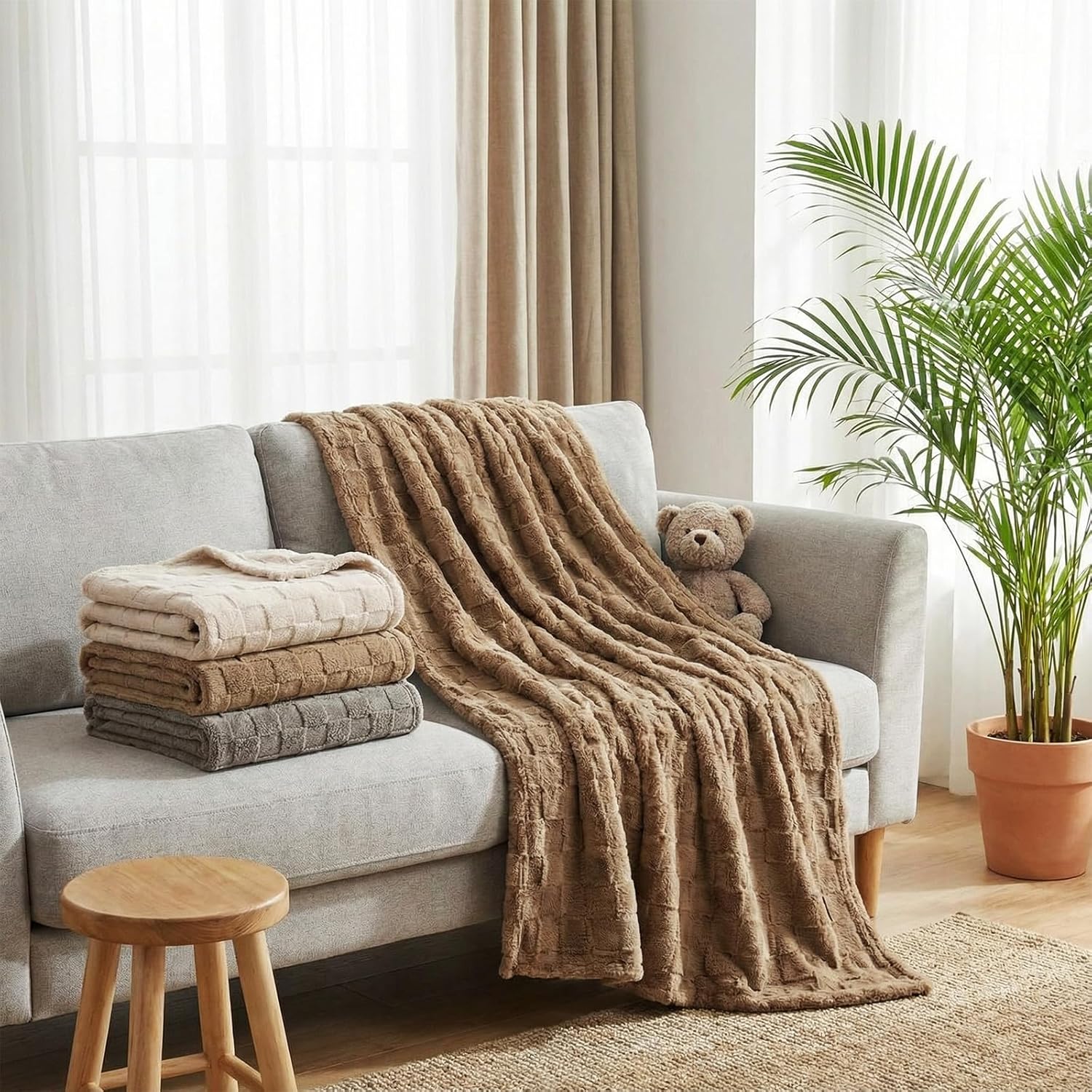 Features: Cozy and Multifunctional: these fleece throw blankets offer warmth and comfort for any occasion. Lightweight and easy to carry, they're ideal for use at home, on the couch, or while traveling. Stylish and Practical: featuring a classic 3D checkered throw blanket design, these soft and durable blankets easily match any decor and are machine washable. Specifications: Material: microfiber polyester Color: neutral Size: 50 x 60 inches / 127 x 152 cm Package includes: 6 x Soft fleece throw blankets Notes: The blankets come vacuum-packed and will be fluffed up by gently patting before use. Manual measurement, please allow slight errors on size. The color may exist a slight difference due to different screen displays