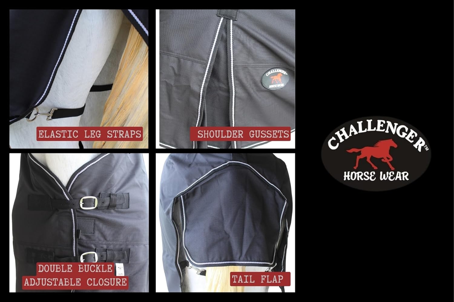 Challenger 1200D Horse Blankets – Built to Perform. Made to Last. Engineered for horses that demand more, Challenger Horse Blankets deliver rugged protection and unbeatable comfort in any season. Crafted from tough, water-resistant materials with reinforced stitching, these blankets are built to withstand the elements while keeping your horse warm, dry, and comfortable. Thoughtful features like adjustable closures, shoulder gussets for enhanced mobility, and secure leg straps provide a tailored fit and freedom of movement. Whether out in the pasture or heading to a show, trust Challenger for durable quality, smart design, and timeless style your horse deserves.