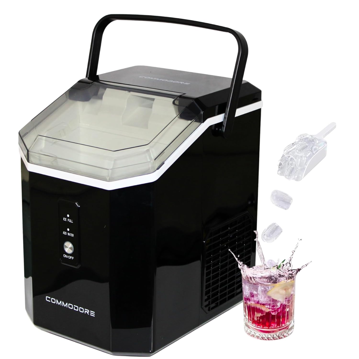 COMMODORE Bullet Ice Maker – Fast, Fresh Ice for Every Occasion Introducing the COMMODORE Bullet Ice Maker, the perfect solution for quick, reliable ice at home, in the office, or on the go. Designed for convenience and efficiency, this compact ice maker produces bullet-shaped ice cubes in just minutes, keeping your drinks chilled without delay. Compact & Portable for Any Space With its lightweight design and small footprint, this ice maker fits perfectly on any kitchen counter, office breakroom, RV, or boat. Whether you're hosting guests or just need extra ice, the COMMODORE Bullet Ice Maker delivers. High-Performance Ice Production Produces 36 lbs of ice per day—enough for all your beverages. Fast ice-making in just 6 minutes—no long wait times. 1.3 lbs ice basket keeps plenty of ice ready to serve. 1.2L built-in water tank—no need for a water hookup. Hassle-Free Operation & Maintenance Self-Cleaning Mode – Press Ice/Clean for 3 seconds to activate automatic cleaning. Drain Cap for Easy Emptying – Quickly remove excess water with no mess. Whisper-Quiet Operation (<45dB) – Perfect for any environment. Energy-Efficient & Reliable – Runs on 120V AC with low energy consumption. The COMMODORE Commitment – A US-Owned Brand You Can Trust COMMODORE is a US-owned and operated company committed to top-tier quality and customer support. Unlike many overseas brands, we provide American-based customer service to ensure you get the best experience. We stand by our products with a hassle-free refund policy, so you can buy with confidence. What’s Included? COMMODORE Bullet Ice Maker Ice Scoop User Manual Perfect for Any Occasion! Whether you need ice for cocktails, sodas, iced coffee, or smoothies, the COMMODORE Bullet Ice Maker delivers fast, reliable performance every time. Compact, efficient, and built to last—your ultimate countertop ice-making solution!