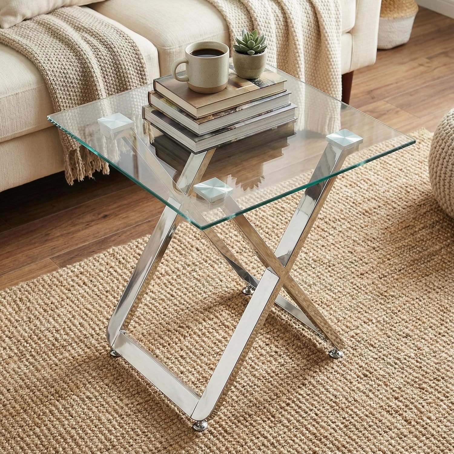 The Axe side table with a X shape base is perfect for smaller spaces. Stainless steel frame in polished chrome finish is perfectly poised with a strong tempered glass top. The contemporary minimal design works well next to accent chairs or any space in need of a limited footprint and big style.