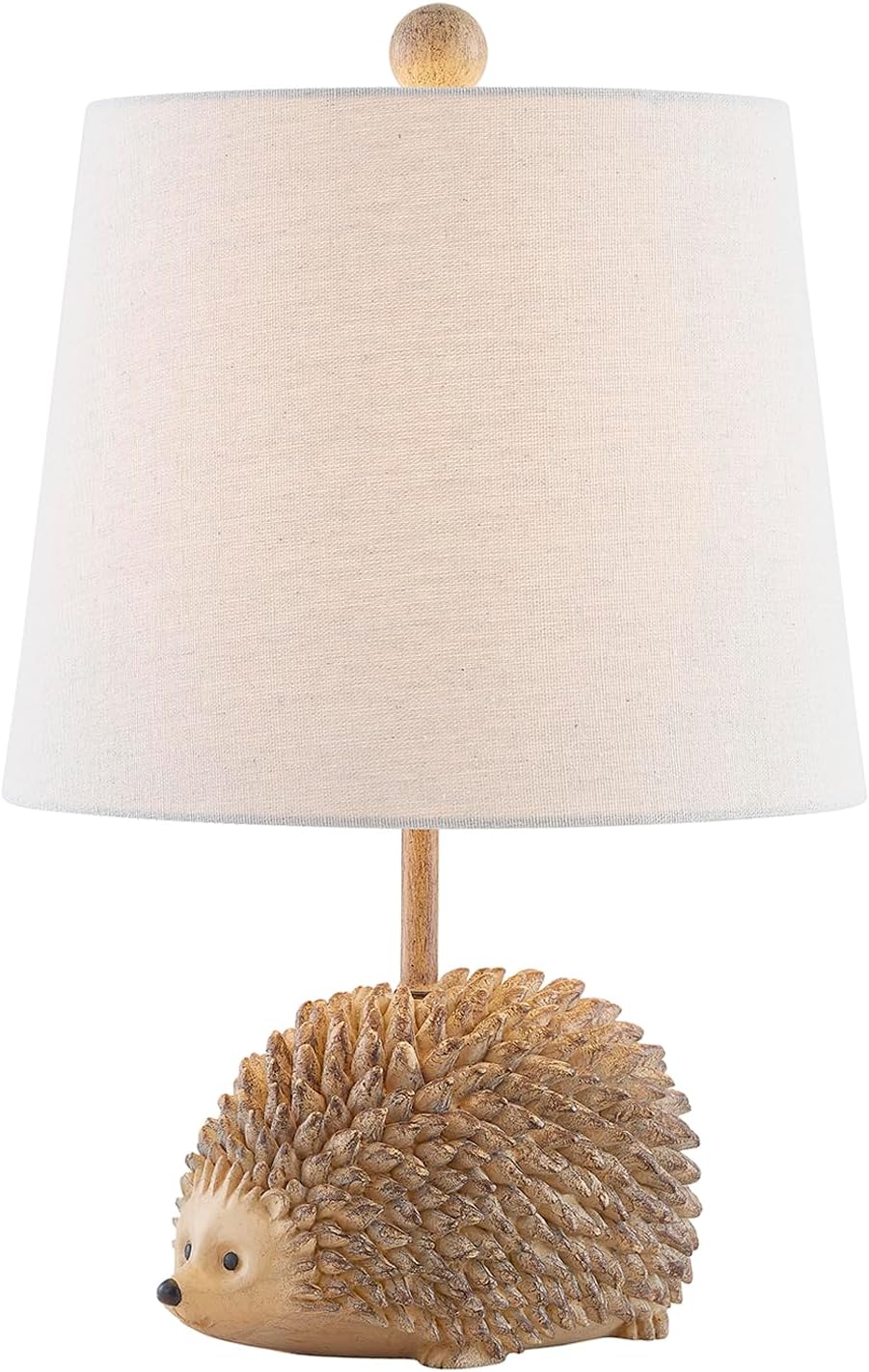 Add a touch of personality and texture with this hedgehog-shaped table lamp. Crafted from brown resin with a layered, pinecone-like surface, it offers sculptural charm and visual interest. The soft oat linen drum shade features a rolled edge and hardback design for a crisp, tailored finish. A wood-toned finial completes the look, and the cord exits neatly at the base to keep surfaces tidy