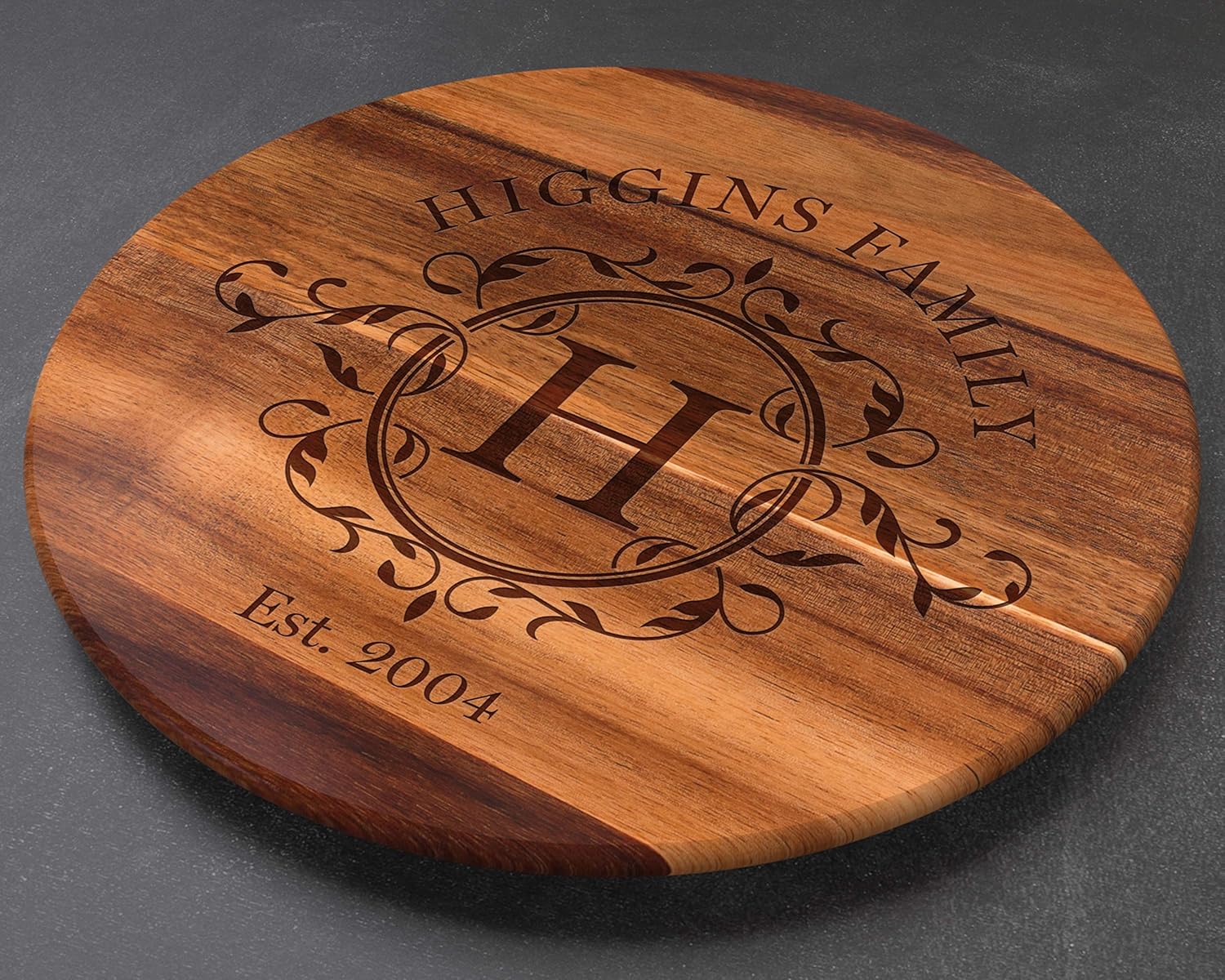 Bring timeless warmth and functionality to your table with this personalized Acacia wood Lazy Susan. Crafted from durable, richly toned Acacia wood, each piece showcases natural variations in color and grain that make it truly one of a kind. The elegant laser-engraved monogram adds a touch of sophistication—customize it with your initial, family name, and established year to create a meaningful centerpiece that celebrates your heritage.