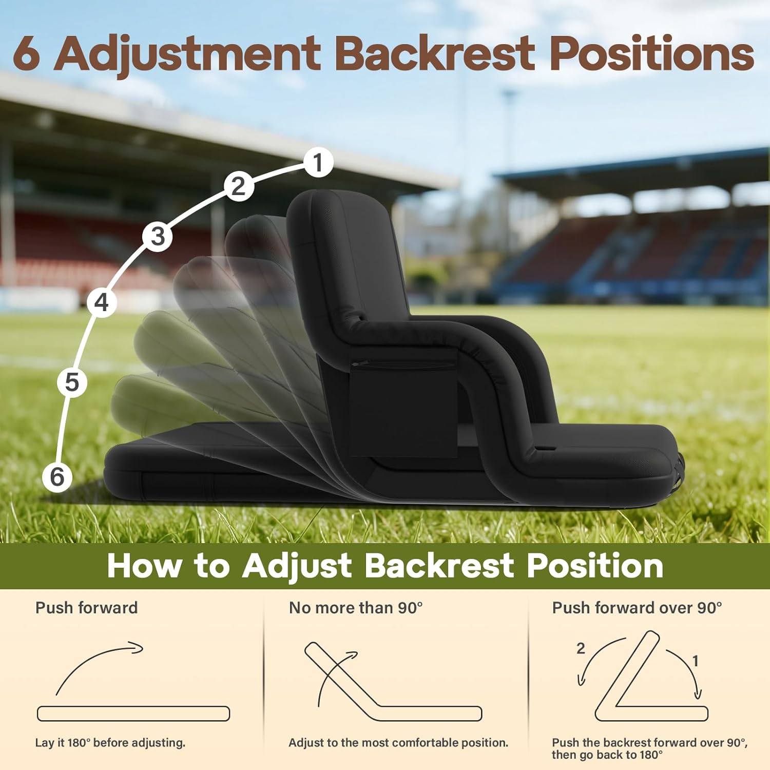 • More Comfort Seat and Backrest: The bleacher chairs with back and cushion come with a 6-position reclining backrest that you can adjust 100° for focused viewing or 135° for napping, which is a must-have for bleachers and stadiums. The left/right armrests of the stadium seats for bleachers lift or lower easily: lower them to expand the width to 25" (great for sitting next to family) or raise them for 20" of focused space (reduces shoulder fatigue).