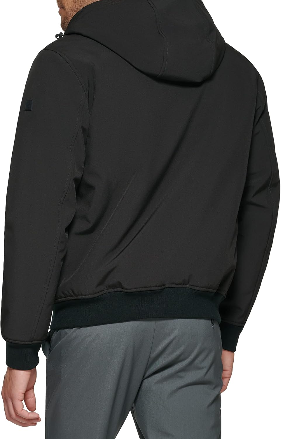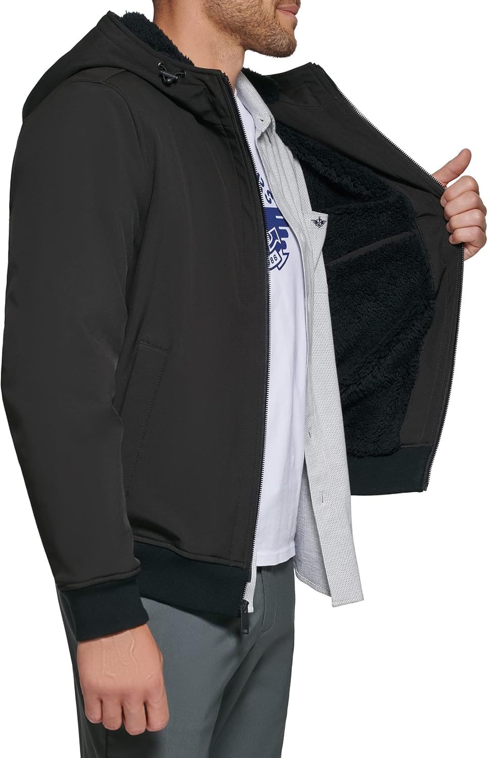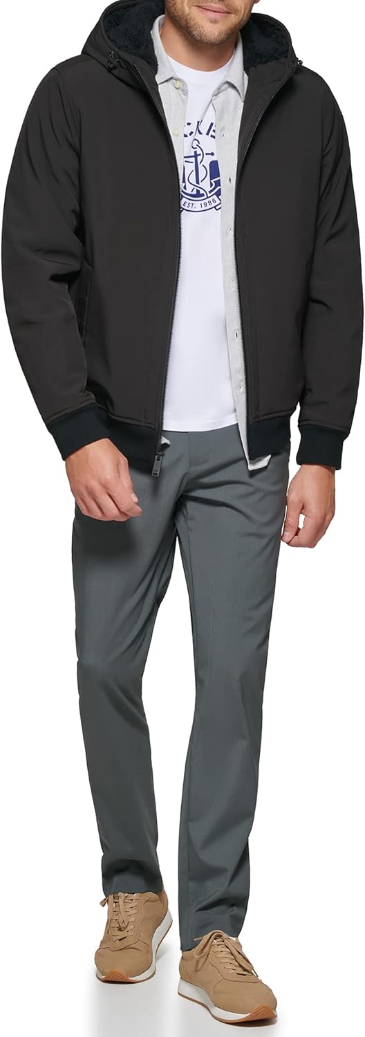 This Dockers Softshell Sherpa Lined Bomber Jacket features a center front zipper closure, soft rib knit cuffs and hem to trap in body heat, two lower pockets, and interior safety pocket, adjustable hood with sherpa lining, and a Dockers patch logo on the left sleeve.