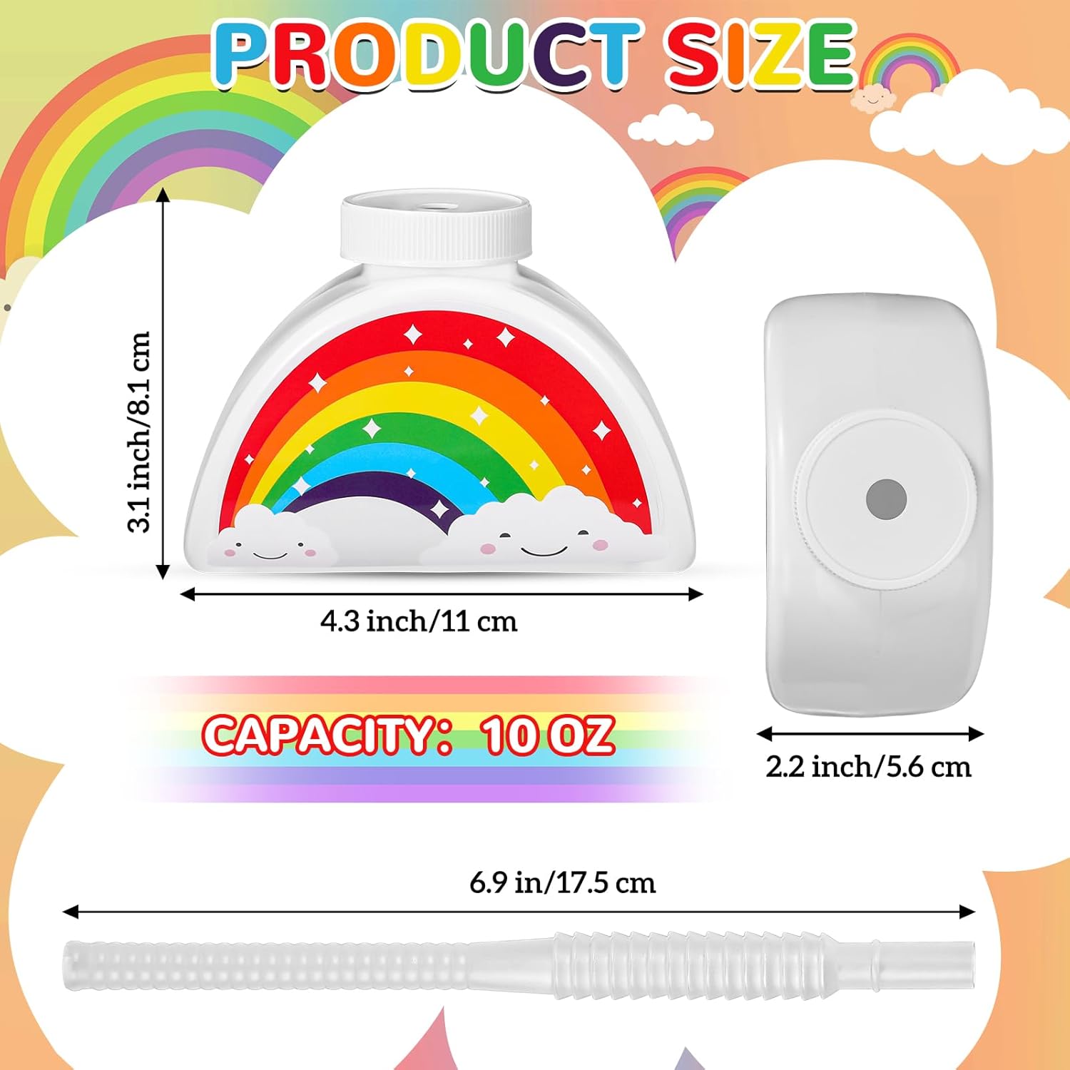 Features: Proper size: The rainbow shape cups measure about 4.3 x 3.1 x 2.2 inches, and the 10 oz capacity of them is suitable for holding water, juice and other beverages. Fantastic gifts: Only are these rainbow sippy cups functional, but they also double as adorable gifts. Your little ones like sipping their favorite beverages out of these enchanting cups. Specifications: Material: plastic Color: as pictures show Capacity: about 10 oz Package includes: 24 x Rainbow cups with lids 24 x Straws Notes: Manual measurement, please allow slight errors on size. The color may exist a slight difference due to different screen displays.