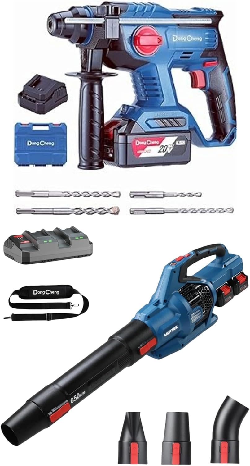 DongCheng Leaf Blower, 650 CFM 40V Cordless Leaf Blower with 2 * 4.0Ah Batteries and Charger, Variable Speed Jet Fan Brushless Motor Electric Leaf Blower for Town Care, Patio, Blowing Leaves and Snow DongCheng 20V Max Cordless Rotary Hammer Drill, 7/8" SDS-Plus, 4 Application Modes, Brushless, 2.1 Joules, 1400RPM, 360° Adjustable Handle, Including 4.0Ah Battery and Charger, 4 Drill Bits