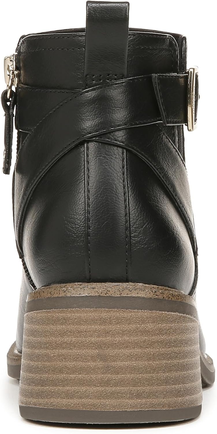 Comfy ankle boots for women accented with our iconic signature buckle. SUSTAINABLY CRAFTED: Linings and topcloth partially made from recycled plastic bottles, recycled toe box and heel counter. MATERIALS: Faux leather or ReFiber – Microfiber made from recycled plastic bottles. FIT: Slip-on with inside zipper and heel pull tab for easy on/off. SUSTAINABLE COMFORT: Anti-microbial, anti-odor Insole Technology with cushioning, comfort, & support. Insoles crafted with cushy, algae-infused BLOOM® foam for cleaner air and water. STYLE: Ankle bootie with wraparound strap, iconic Dr. Scholl's buckle, built-in stretch, and 2 stacked block heel. CONSCIOUSLY PACKAGED: This style is shipped in a box made with recyclable materials & soy-based inks. Love your look in these cute, comfy boots with iconic styling and feel-good comfort.