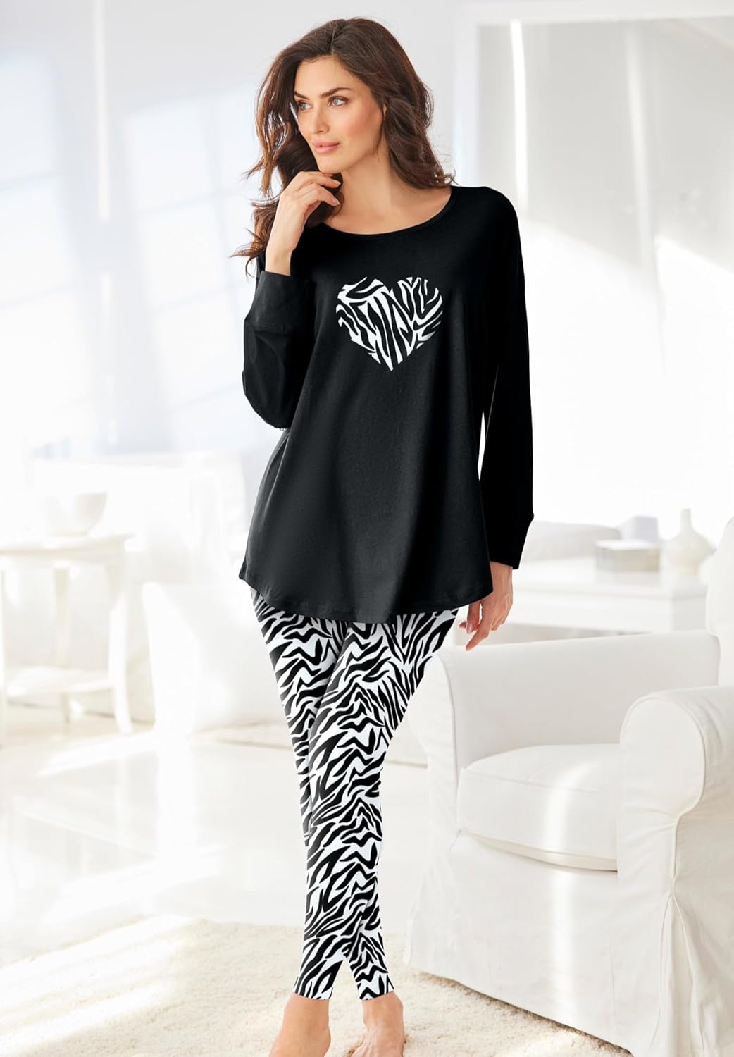 Sweet dreams are yours in these colorful and comfy pajamas. The top is made in a relaxed fit for comfort with a shirttail hem for style. Stretch leggings with an elastic waistband are super comfortable and a perfect fit every time. Top: 32" length; legging: 28" inseambr>Top: pure cotton; heather grey top: cotton/poly; legging: cotton/spandex; importedbr>Machine washable