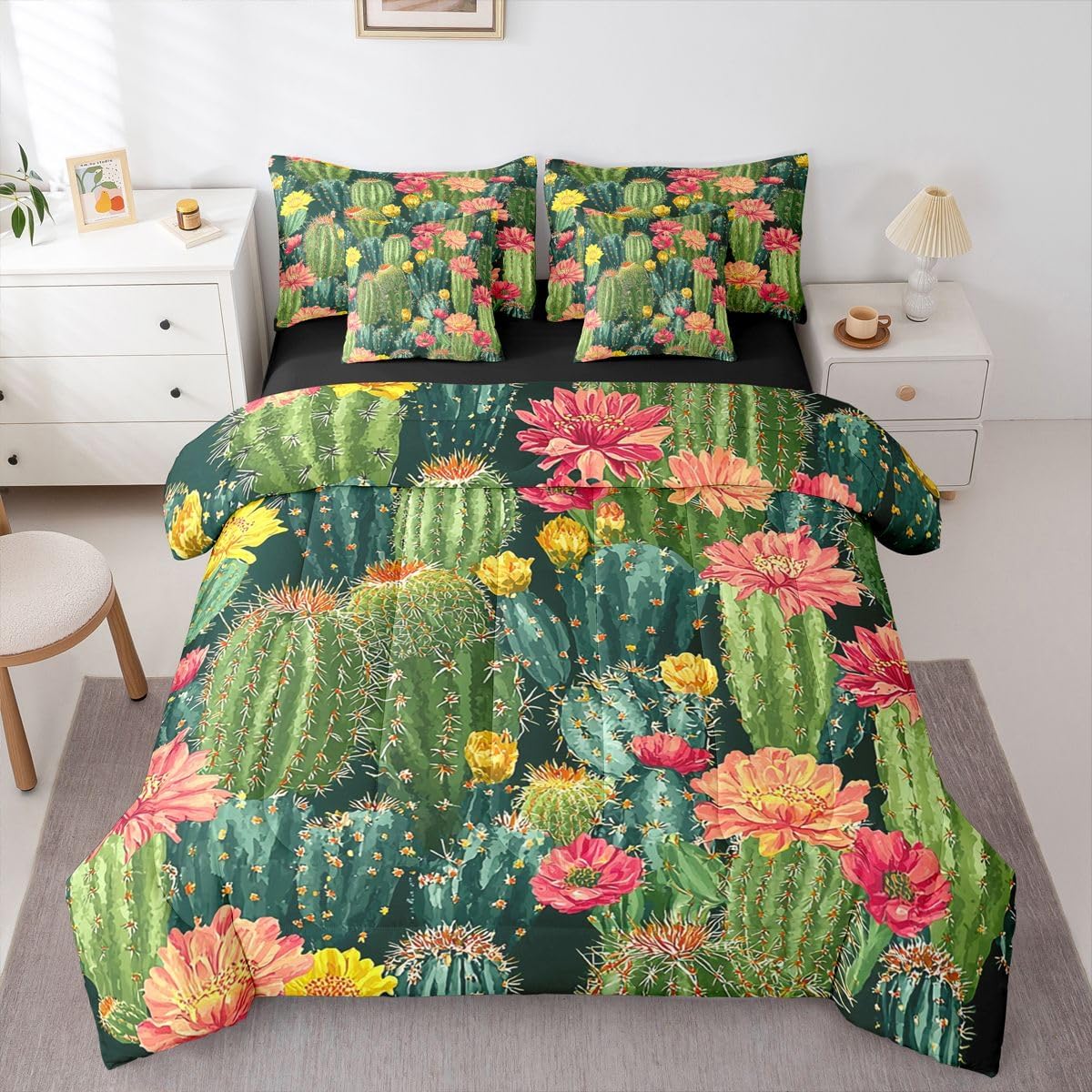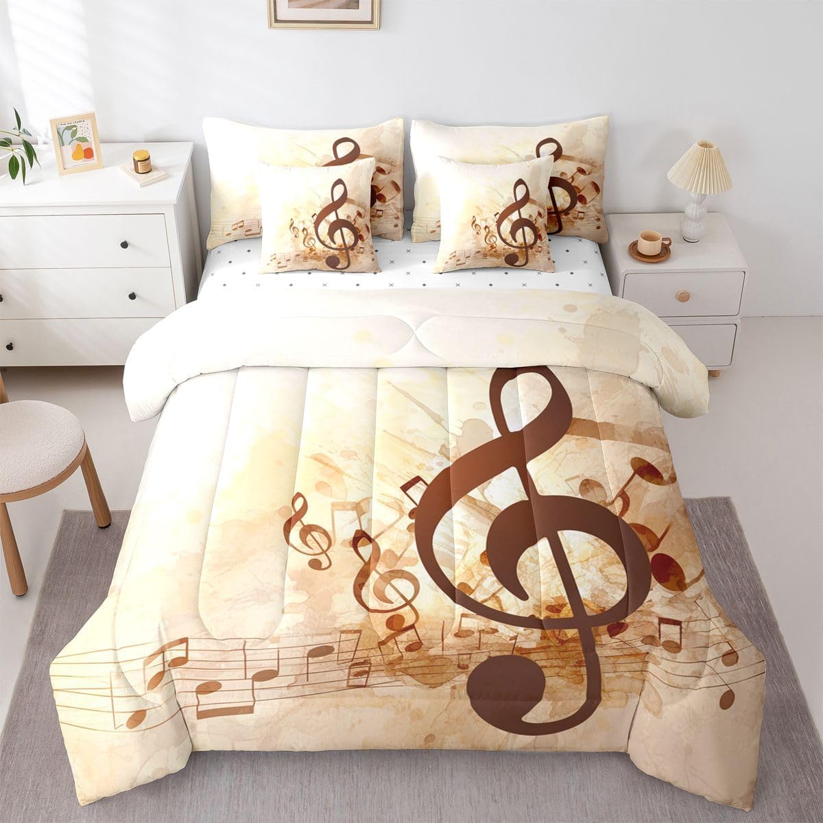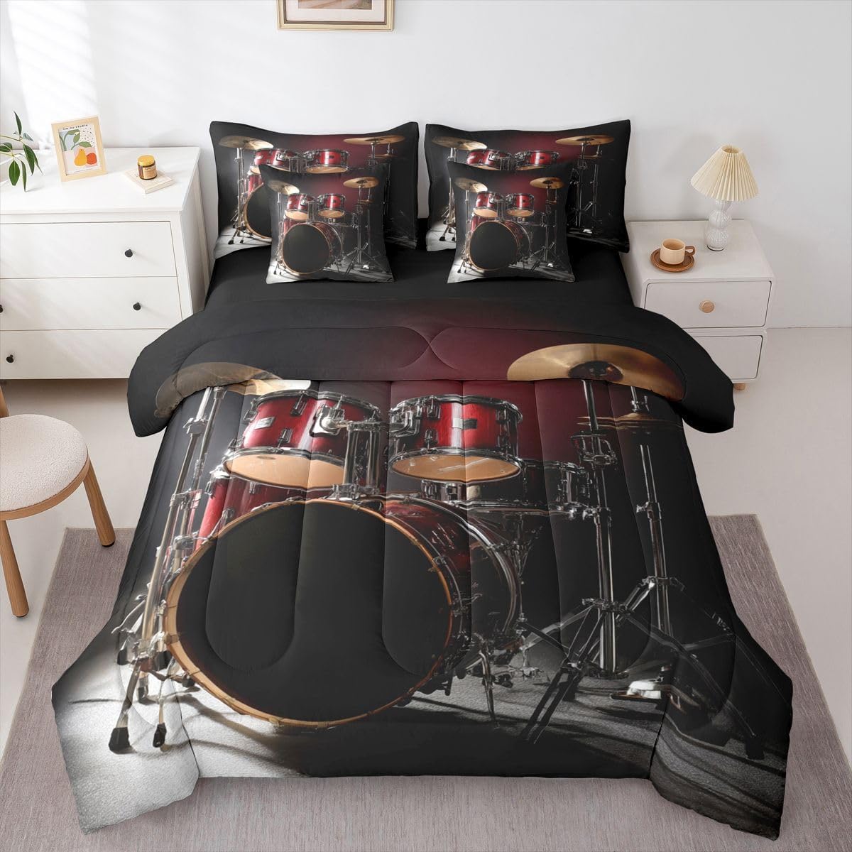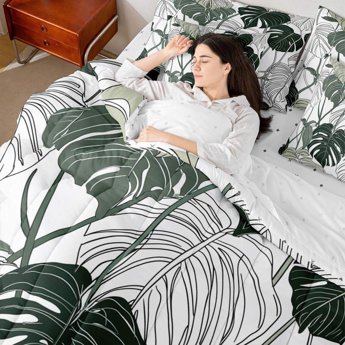 Size Information Twin : 1 Comforter: 68"x90",1x Fitted Sheet 39"x75"x16",1x Flat Sheet 96"x66",2x Pillowcases 20"x30" and 2 Pillow Cover 18"x18" Full : 1 Comforter: 79"x90",1x Fitted Sheet 54"x75"x16",1x Flat Sheet 96"x66",2x Pillowcases 20"x30" and 2 Pillow Cover 18x18" Queen : 1 Comforter: 90"x90",1x Fitted Sheet 60"x80"x16",1x Flat Sheet 102"x90",2x Pillowcases 20"x30" and 2 Pillow Cover 18"x18" King : 1 Comforter: 104"x90",1x Fitted Sheet 78"x80"x16",1x Flat Sheet 106"x90",2x Pillowcases 20"x36" and 2 Pillow Cover 18"x18" Style Variety: Available in multiple styles. Suitable Spaces: For use in bedrooms, guest rooms, living rooms, or RVs. Printing Process: Manufactured using reactive printing and dyeing technology. Design Feature: Diverse pattern options. Care Instructions: Machine washable. Air dry. Low-heat ironing recommended. Not suitable for bleach, dry cleaning, or machine drying. Intended Decor: Designed for home textile applications.