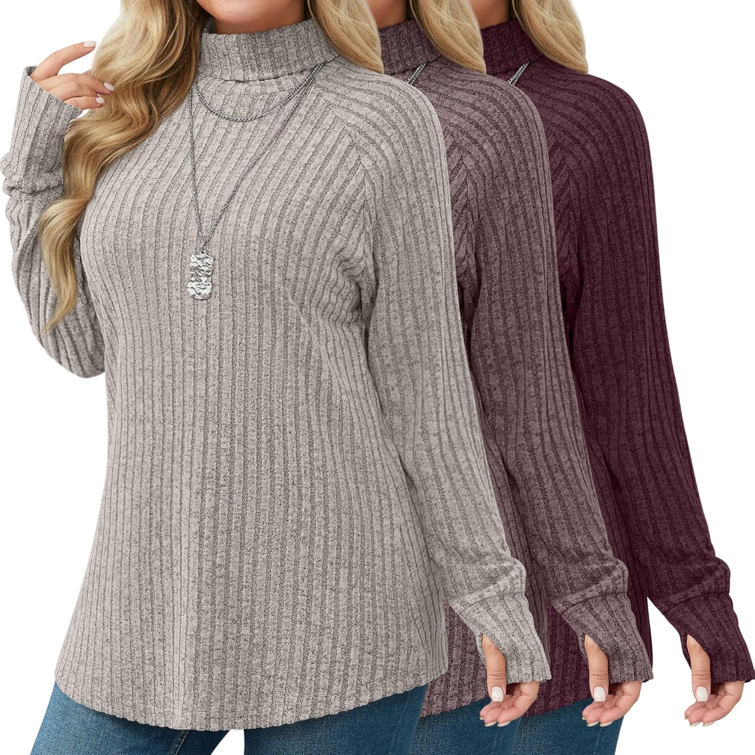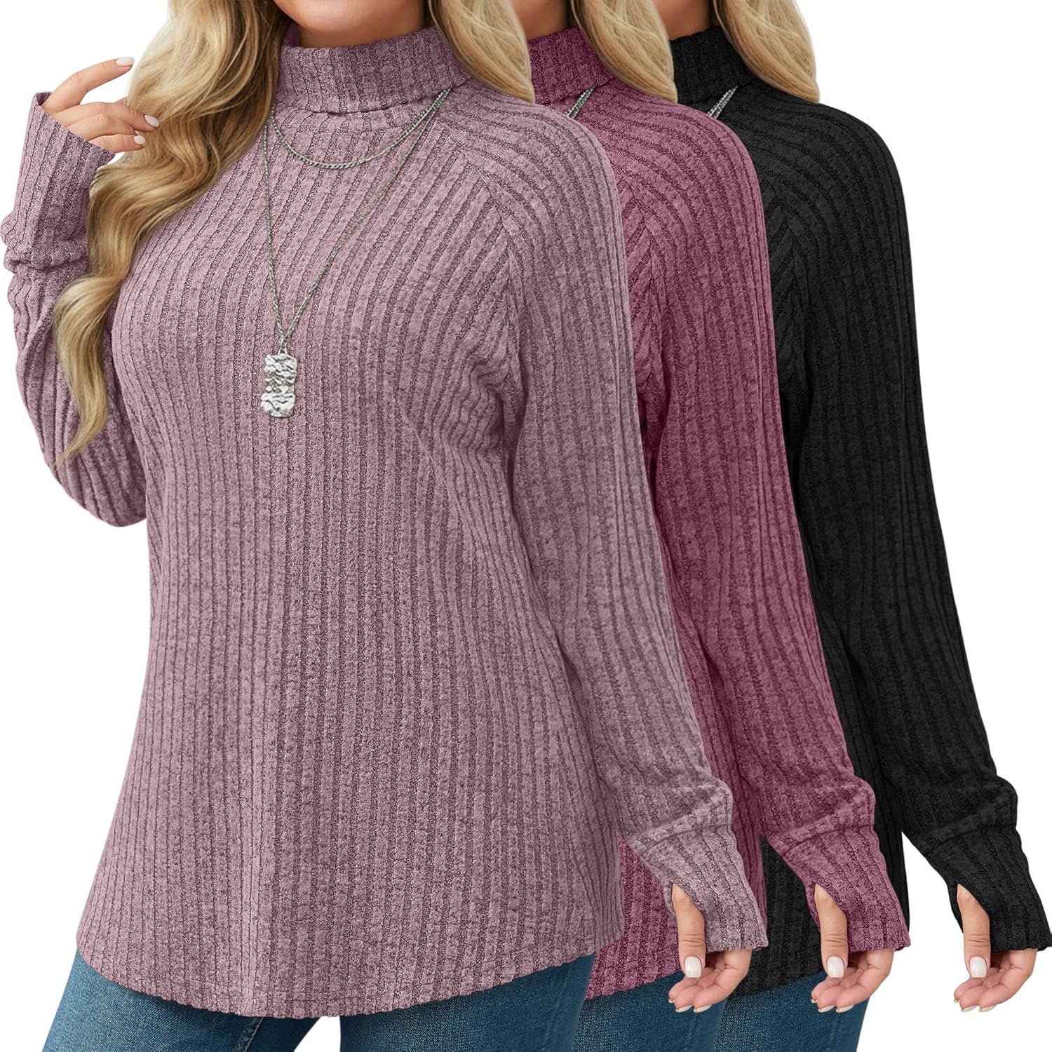 Features: Size selection: Please check our size chart before you place order for comfortable wearing. Clothing maintenance: : Machine washable or hand wash with cold water, easy to wash and dry, hang or line dry Material: 60%Polyester, 35%Rayon, 5%Spandex Package includes: 3 x Women's plus size turtleneck ribbed long sleeve sweater tops with thumbhole Notes: Manual measurement, please allow slight errors on size. The color may exist a slight difference due to different screen displays