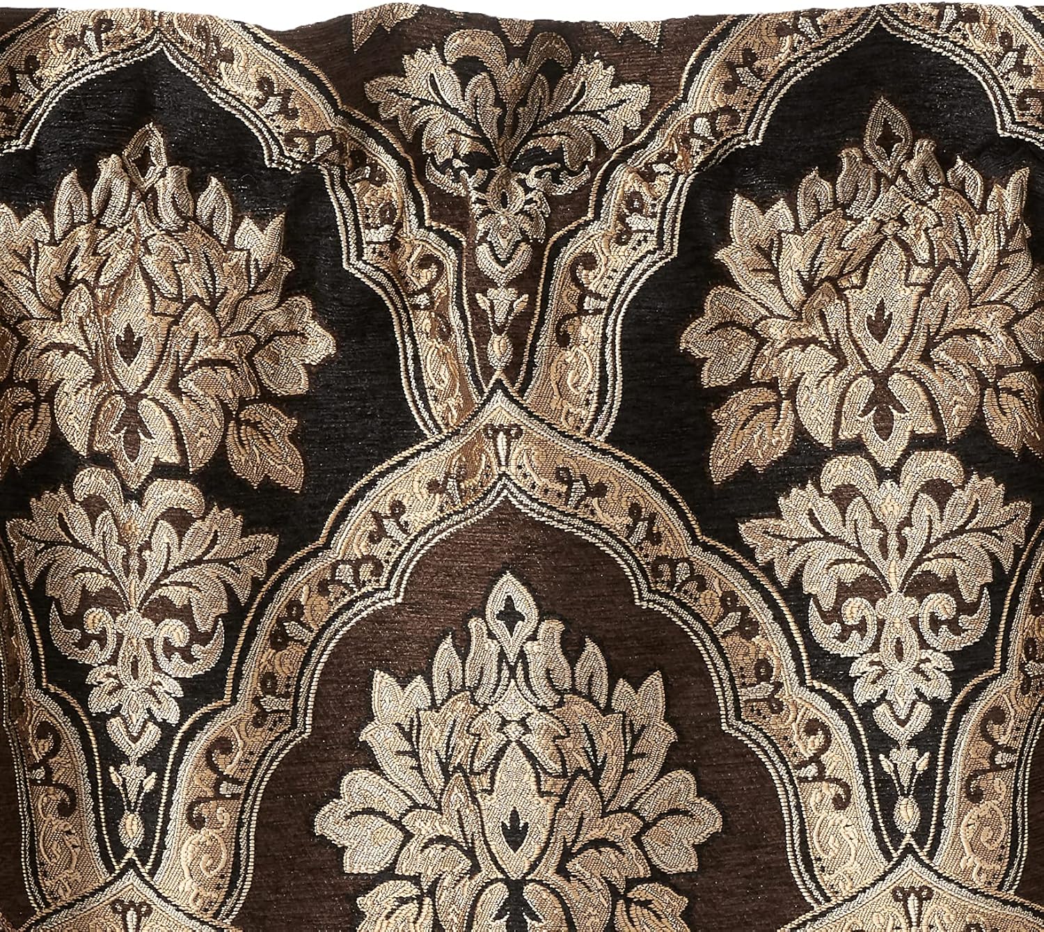 Add a touch of traditional elegance to your living room or bedroom by adding the Reilly Ascot window valance by Five Queens Court. The Ascot valance features a gorgeous traditional woven chenille damask pattern in rich black, brown and gold tones. Trimmed with a gorgeous gimp braid and finished with a glamorous crystal tassel fringe. The rod pocket construction allows for a hassle free setup. The valance coordinates with the Reilly window panel pair for a truly complete layered style. In order to achieve the look in the photo, we suggest using three valances.