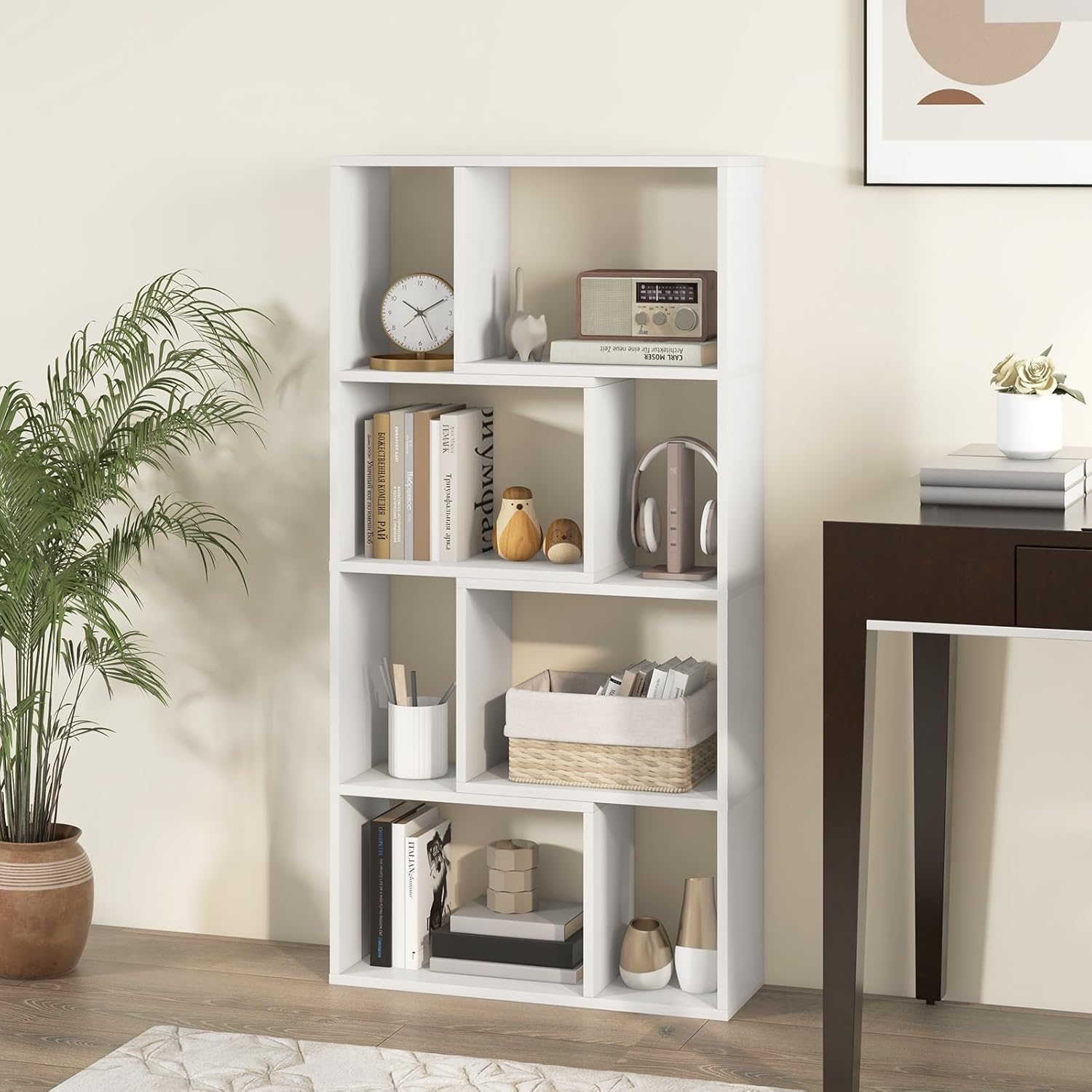 A functional and stylish solution to your storage needs! The geometric design creates a captivating contrast, making it an eye-catching piece to your home. This modern 8-cube storage organizer offers ample space to showcase and organize your books and favorite collectibles. Crafted from thickened board, the floor standing bookcase is sturdy and durable enough to support long-lasting use. 2 anti-toppling devices are provided to ensure stability and safety. You can confidently place heavy items on the shelves without worrying about tipping over. Beyond its stylish appearance, this wooden storage organizer is designed with functionality in mind.