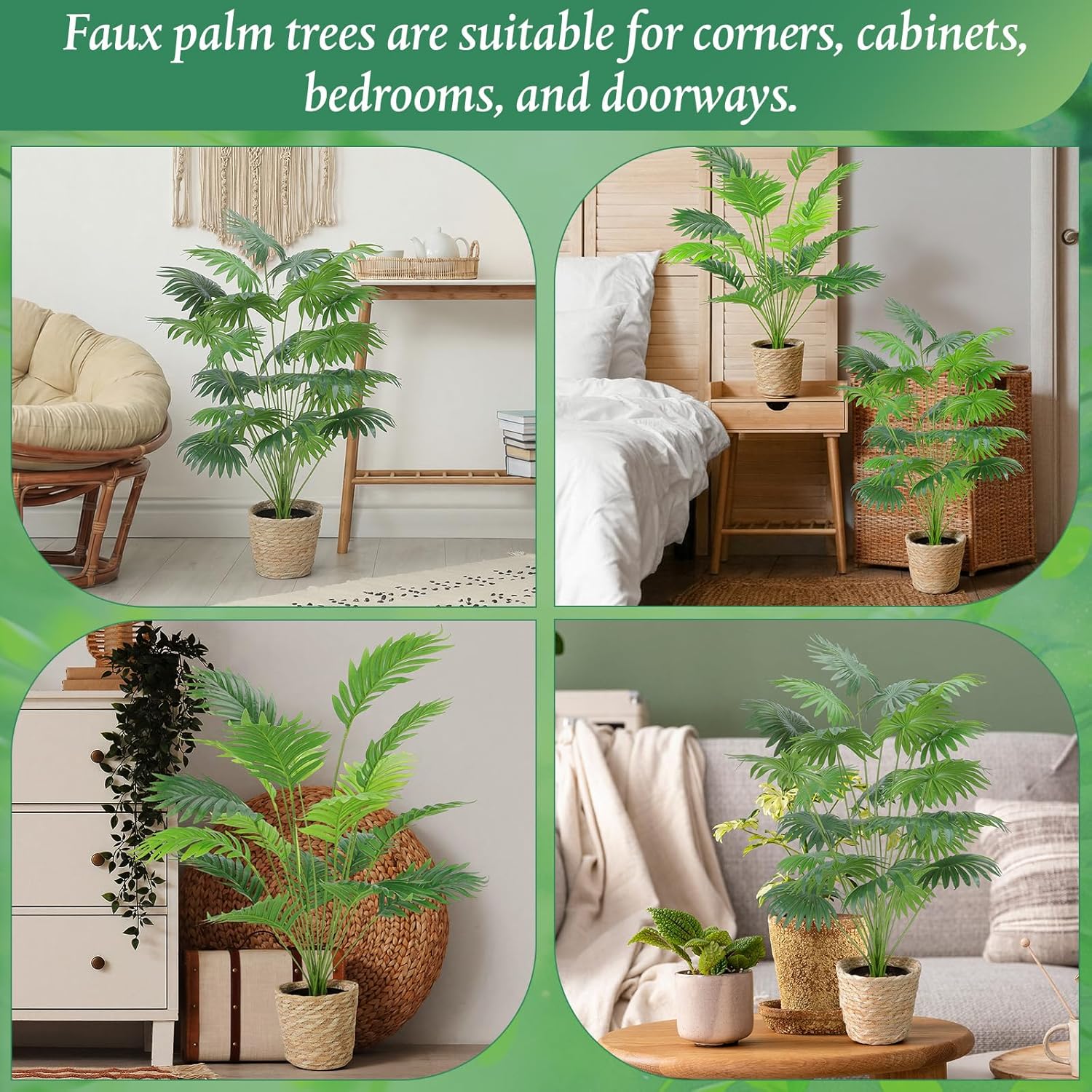 Features: This indoor artificial palm tree is made from carefully selected plants, with delicate, smooth leaves that resemble feathers and slightly curved petioles. It remains evergreen year round, allowing you to experience the romance and beauty of nature without leaving home. One of the advantages of artificial trees compared to real trees is their ease of maintenance. No watering, pruning, or direct sunlight is required. Simply wipe away the dust to maintain its perfect appearance. Specifications: Material: plastic Color: green Size: Woven basket: about 8.3 x 6.7 inches/ 21 x 17cm 18-head artificial palm plant: about 31 inches 24-head artificial palm plant: about 33 inches Package includes: 8 x Woven basket 8 x Artificial palm plant 8 x Black flowerpot Notes: Manual measurement, please allow slight errors on size. The color may exist a slight difference due to different screen displays