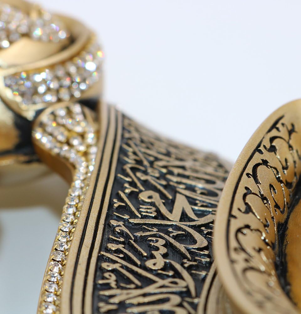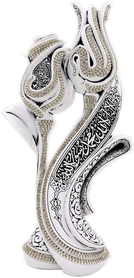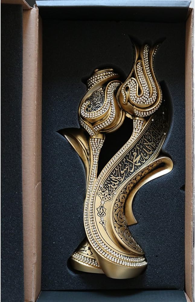 Beautiful Islamic Home Decor Item This Muslim showpiece features the Rose (Muhammad) and Tulip (Allah), with inscription of the Tawhid (declaration of oneness of Allah). Accented in rhinestones 28cm tall x 13cm wide, about 8x8cm at base (11in x 5in, about 3x3in at base). Made in Turkey. Due to the manufacturing process and hand-finished detailing, this item may have minor imperfections.