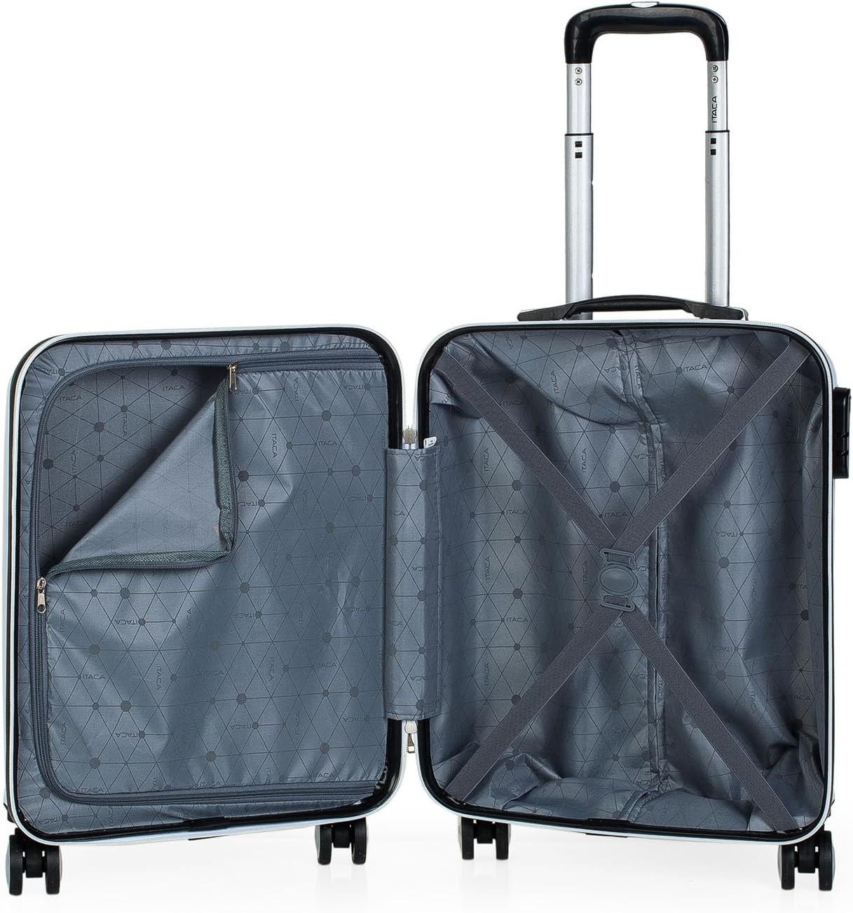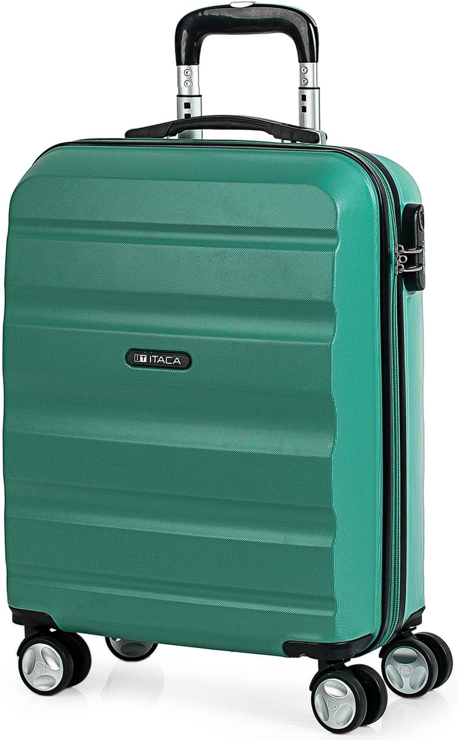 Maleta Trolley Cabina pequeña de la firma ITACA. Equipaje de mano. Tamaño permitido low cost. Viajes cortos. Mango telescópico y 4 ruedas grandes dobles giratorias 360º. ABS Muy resistente a los golpes. Rígida y ligera. Candado de combinación integrado. Cierre doble cursor. Asas retráctil vertical. Máxima comodidad para traslado manual. Interior forrado. Separador con cremallera y bandas elásticas ajustables. Varios compartimentos. Medidas: 55x39x20 cm. Peso: 2, 85 kg. Material: ABS.