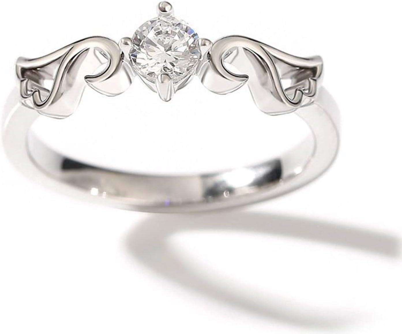 Product Descriptions Dainty and delicate, this modern design features abstract angel wings and a sparkling round cut stone. Angel wing jewelry is very special because it has a personal meaning affixed to it. This symbol is related, of course, to angels, who symbolize protection, affection, and harmony. Angels provide hope and happiness, which is exactly what this ring is supposed to do. Primary Stone Number of Stones :1 Carat Weight :0.28 ct Stone Shape :Round Stone Color :Diamond White Stone Size :4 mm Stone Type :Jeulia Stone Setting Information Metal :925 Silver Weight :2.22 g Width :2.4 mm Height :3.7 mm Thickness :1.3 mm