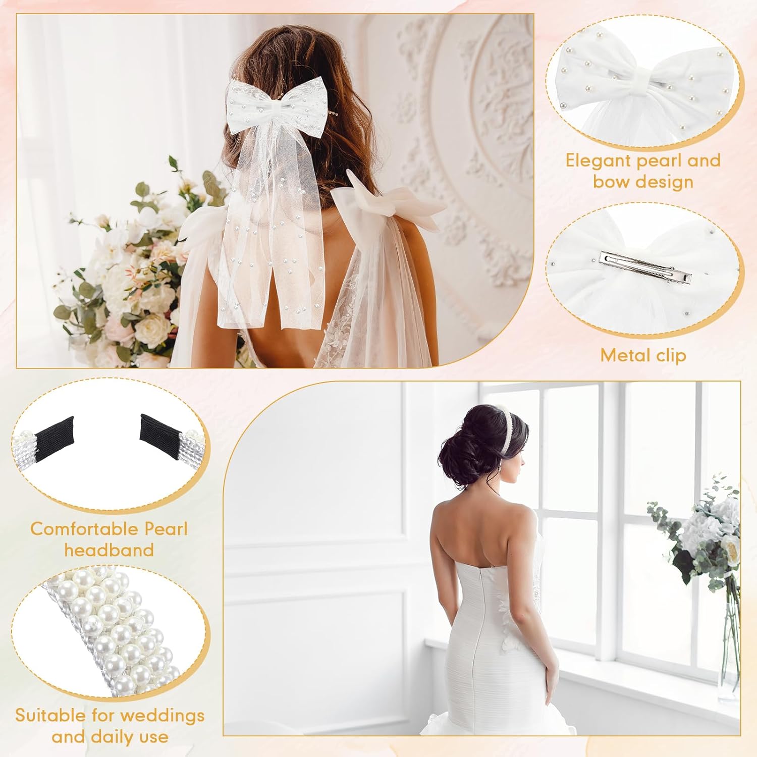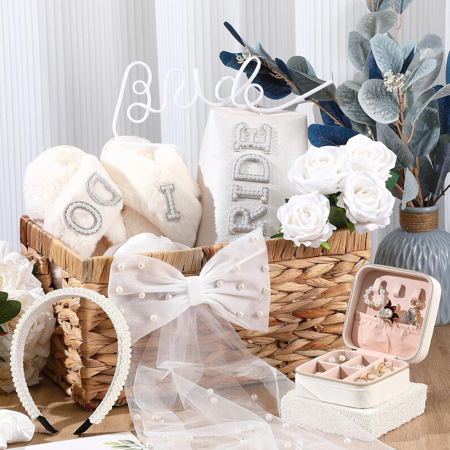Features: Ideal colors: The bridal gifts for bride set primarily comes in colors of white and brown, a classic and stylish combination that resonates with the purity and earthiness of a wedding ceremony. Attractive bride theme: A featuring engagement gifts set that combines an ideal combination of bride themed designs, proper sizes, and wide application. It's not only made from reliable materials but it also offers a warm and thoughtful gift option for a bride to be. Every piece in this set is designed with attention to detail, making it truly special and distinguished. Specifications: Material: Gift basket: water asparagus Slippers: fluffy fabric and TPR Make up bag: PU leather Size: Gift basket: 14 x 9.65 x 6.9 inches/ 35.5 x 24.5 x 17.5 cm Slippers: 10.24 inches/ 26 cm, suitable for size 8-9 Make up bag: 7.9 x 3.5 x 5.1 inches/ 20 x 9 x 13 cm Jewelry box: 3.94 x 3.94 x 1.97 inches/ 10 x 10 x 5 cm Pearl headband: 5.51 x 5.51 inches/ 14 x 14 cm Pearl veil: 17.72 x 7.87 x 4.72 inches/ 45 x 20 x 12 cm Fake rose: 11.81 inches/ 30 cm long Main color: white, brown Package includes: 1 x Gift basket 1 Pair of slippers 1 x Make up bag, 1 x jewelry box, 1 x pearl headband, 1 x pearl veil, 4 x fake rose, 1 x jewelry tray, 1 pack of grass, 1 x straw, 1 set of sleep mask Notes: Manual measurement, please allow slight errors on size. The color may exist a slight difference due to different screen displays.