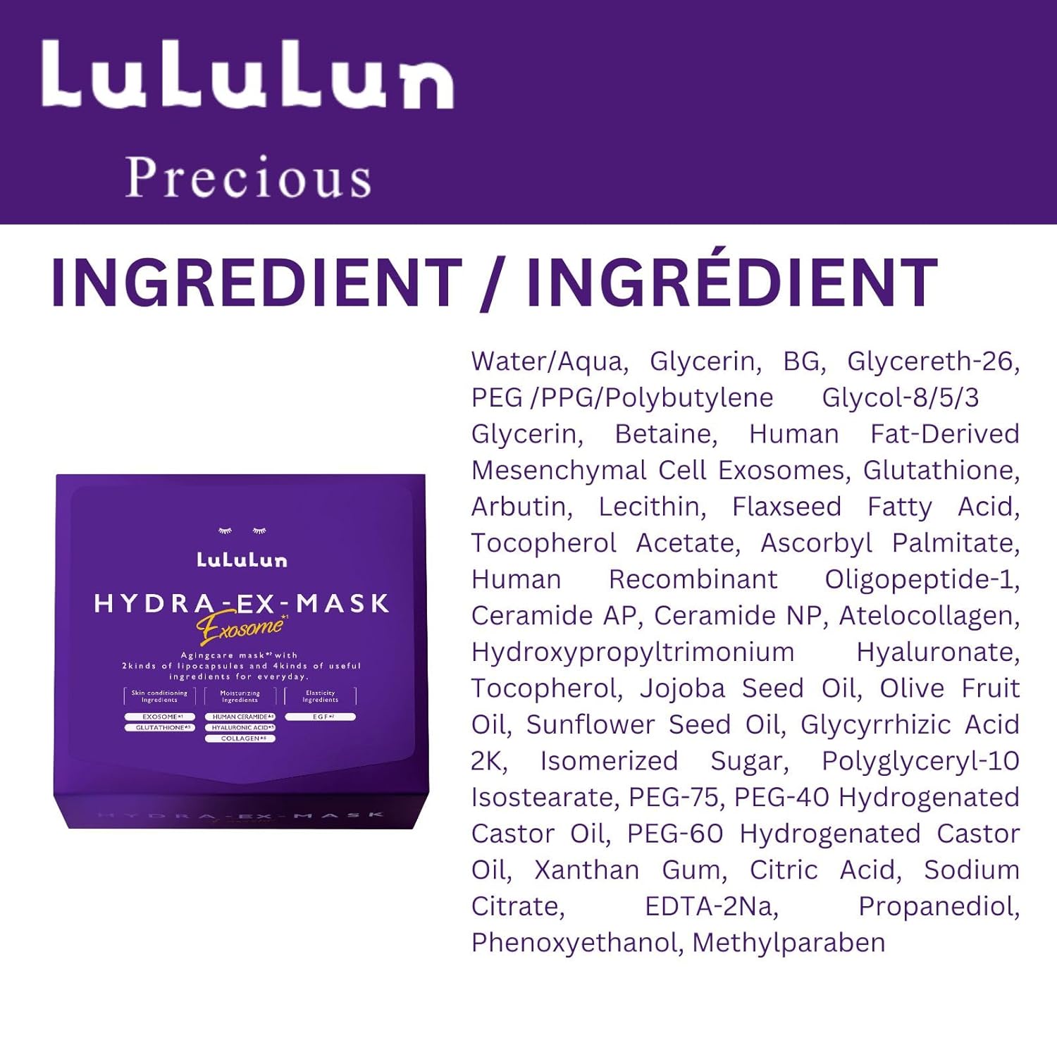 LuLuLuLun Hydra EX Mask, 28 Piece Face Mask, Daily Aging Care Inspired By Advanced Regeneration Technology, Japanese Human Fat Exothomes *2 and White Ball *3 Glutathione *4 for resilience, transparency *5, for smooth and smooth skin. Focuses on the synergistic effect of exosome and glutathione. (Also formulated with 4 types of beauty support ingredients that tend to decrease depending on your age) 1. Skin Conditioning Ingredients: Human fat-derived mendfolial cell exosome *2 (does not contain stem cells), white ball *3 Glutathionone *4 2) Hali Ingredients: EGF (human origopeptide) *6 3. Moisturizing Ingredients: Humanoid type ceramic *7, Suction Hyaluron Acid: 8 Lagen *9 [Raw Feeling] We have researched the amount of liquid that feels the softest of the sheets to achieve a comfortable feeling of being sandwiched by a layer of water. Contents: Large capacity 28 pieces (Essence 510 mL) of moisturizing + α Hydra series. *Care instructions for moisturizing and resilience to your skin depending on age 2 Skin conditioner ingredients: Human fat-derived exosome *3. A glossy skin with a smooth texture like white balls. *4. , lecithin. 5. Moisturizes and prevents dulling due to dryness. *6 Hali ingredient: Human genetically modified oligopeptide-1 *7 Moisturizing ingredient: Ceramide AP, Ceramide NP. *8 Moisturizing ingredient: Hydroxypropyl limmonium Hyaluronic acid *9 Moisturizing ingredient Aterocollagen