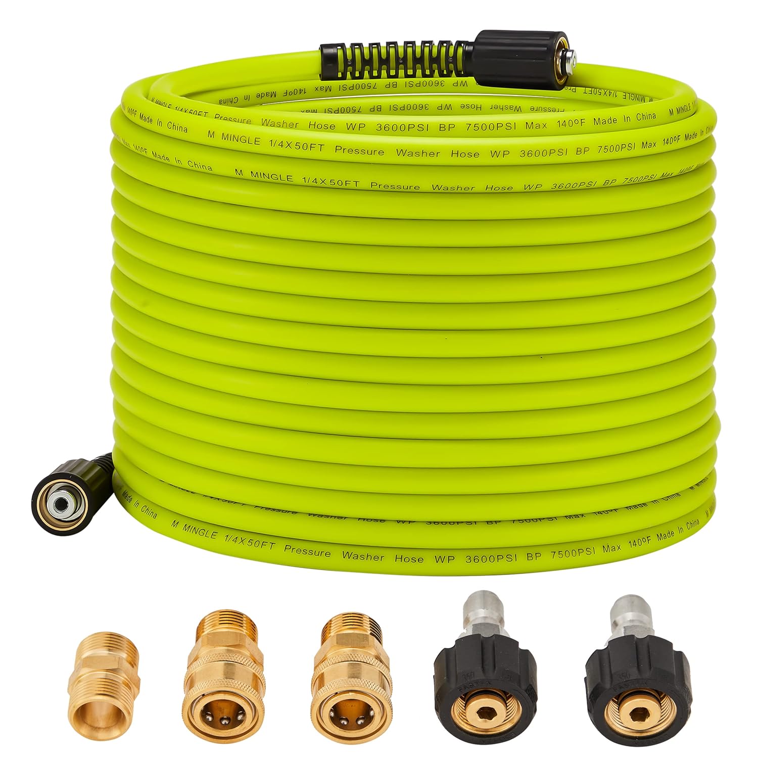 Universal pressure washer spray gun has M22 14mm or M22 15mm fitting. M22 14mm fitting is compatible with Generac, Simpson, Briggs Stratton, craftsman, karcher, Ryobi pressure washer. M22 15mm fitting is compatible with Sun Joe, Campbell, MI-T-M, AR Blue, Stanley, Cleanforce, Simoniz, Excell power washer.Attention: Not fit gardenhoses, waterhose or your faucet directly. If pressure washer hose has M22 14mm fitting with 14mm inside diameter, please connect to hose directly. If hose has M22 15mm fitting with 15mm inside diameter, please connect the brass coupler between gun and hose.Change the length of pressure washer gun based on your application. Easy to change pressure washer long gun to short gun. Three Length:40 inch, 25 inch, 8.8 inch. Replacement pressure washer trigger gun fits gas and electric pressure washer with M22 fitting.UNIVERSAL REPLACEMENT HOSE - The pressure washer extension hose is designed for household cleaning and commercial use. Compatible for most brand power washers, such as Karcher, Troy Bilt, Ryobi, Honda, Simpson, Generac, Flexzilla, Craftsman, Green Work, Briggs and Stratton, Dewalt and more. ATTENTION: NOT FIT M22 15mm fitting.PREMIUM PERFORMANCE - Max working pressure is 3600 PSI. Max temperature is 140℉ / 60℃. 50ft pressure washer hose is made from premium quality, durable, weather and abrasion-resistant material. Easy to carry, drag and roll up. Nonmarking and Never kink permanently.