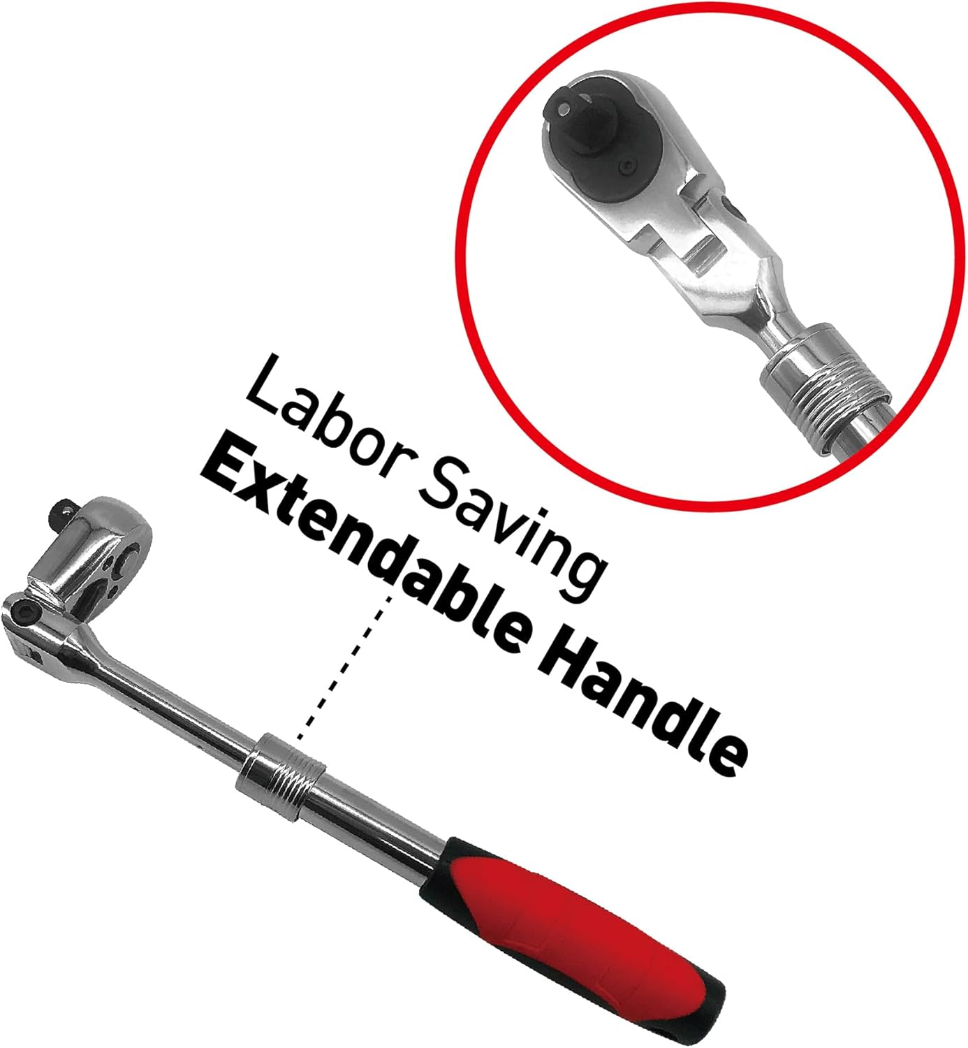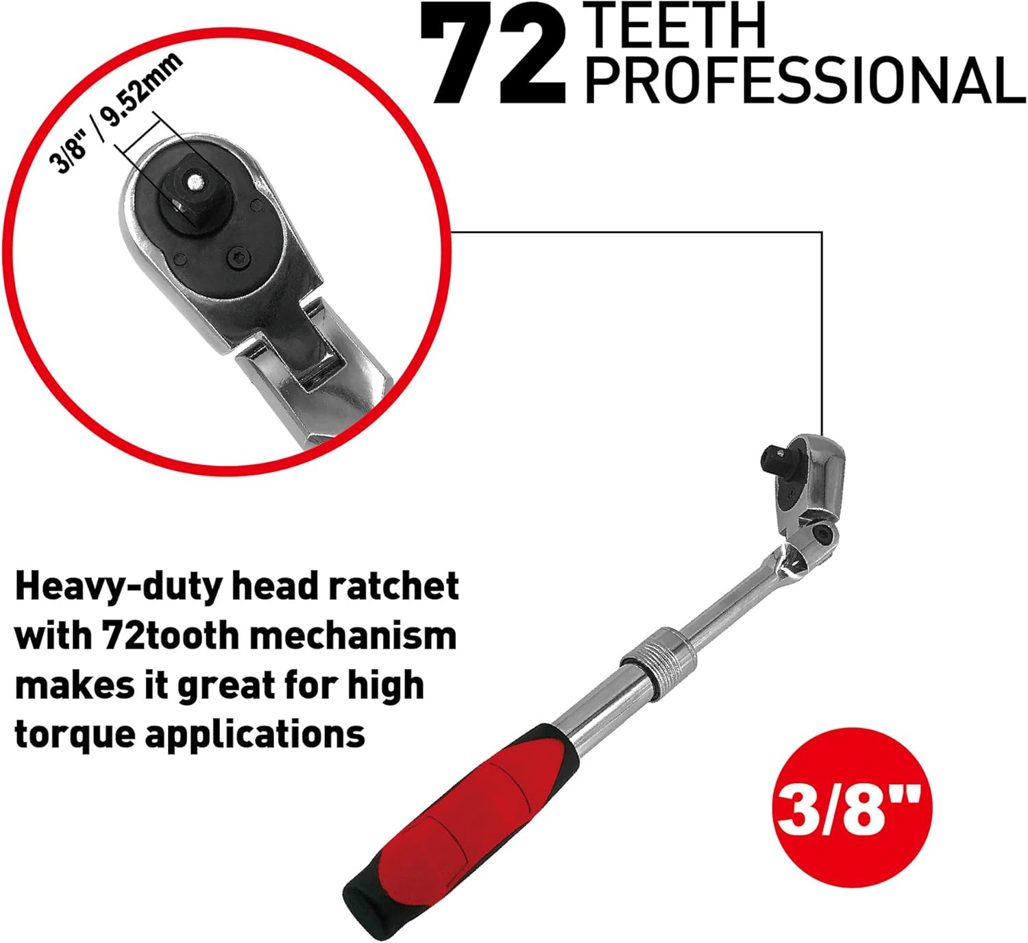 This versatile 3/8-inch drive telescoping flex head ratchet combines convenience and functionality in one professional-grade tool. The telescoping handle extends from 9.8 inches to 13.8 inches, giving you extra reach and leverage when needed. With 72 teeth in its ratcheting mechanism, this tool offers precise control and smooth operation. The flex head design allows for multiple working angles, while the quick-release feature enables fast socket changes. The comfortable grip with ergonomic red and black handles provides excellent control and reduces hand fatigue during extended use. At just 3cm/1.2 inches in width, this slim profile ratchet can access tight spaces effectively. Perfect for automotive work, general repairs, and professional mechanics who need a reliable, adjustable-length ratchet in their toolbox. The durable construction ensures long-lasting performance for all your fastening needs.