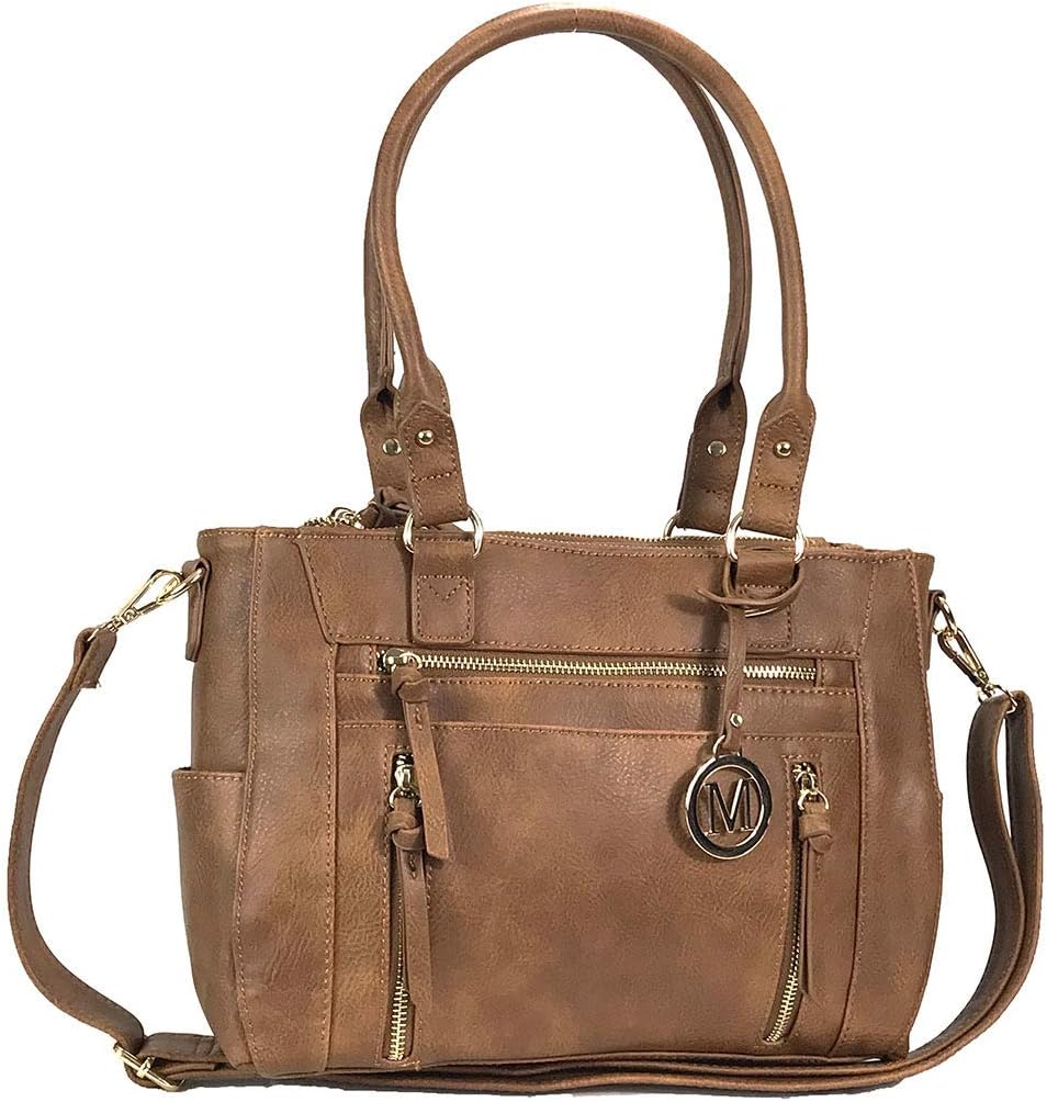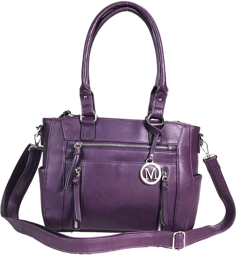 This medium size multi-function concealed and carry handbag looks no different than a fashion and stylist Shoulder bag. Purse is full of functional pockets: big snap front pocket, big front zipper pocket, two slot pockets, 3 main zipper compartments. Come with a long Shoulder strap so it can be used as a cross body bag and give you hand free freedom when you are outing. Flat bottom and heavy duty high quality material smooth and soft, looks and feel like high quality cowhide leather. Most surprising fact: the back Velcro concealed and carry pocket with holster are using high quality locking zipper with key. It is a zip all around pocket so you can position your gun for any position you want including left hand draw, right hand draw and top draw access. Extra deep ( 1.5" ) and plenty of room for your gun and can also used as a big spacy front pocket with lock. Switch the back and front and you have a total different look purse! Pretty decent capacity yet look compact and pretty, multiple zippers & pockets help easily organize your stuff: snap button front pocket, front zipper pocket can hold IPhone X and IPhone 8, back zipper pocket, 3 main zipper compartments. Cell pouches in middle compartments. Heavy duty locking concealed and carry pocket zipper with locking key. Good quality hardware and nice craftsmen ship on every purse details. "M" Brand dangling show the supreme value of a high end , well designed, unique purse, presented by Zzfab.