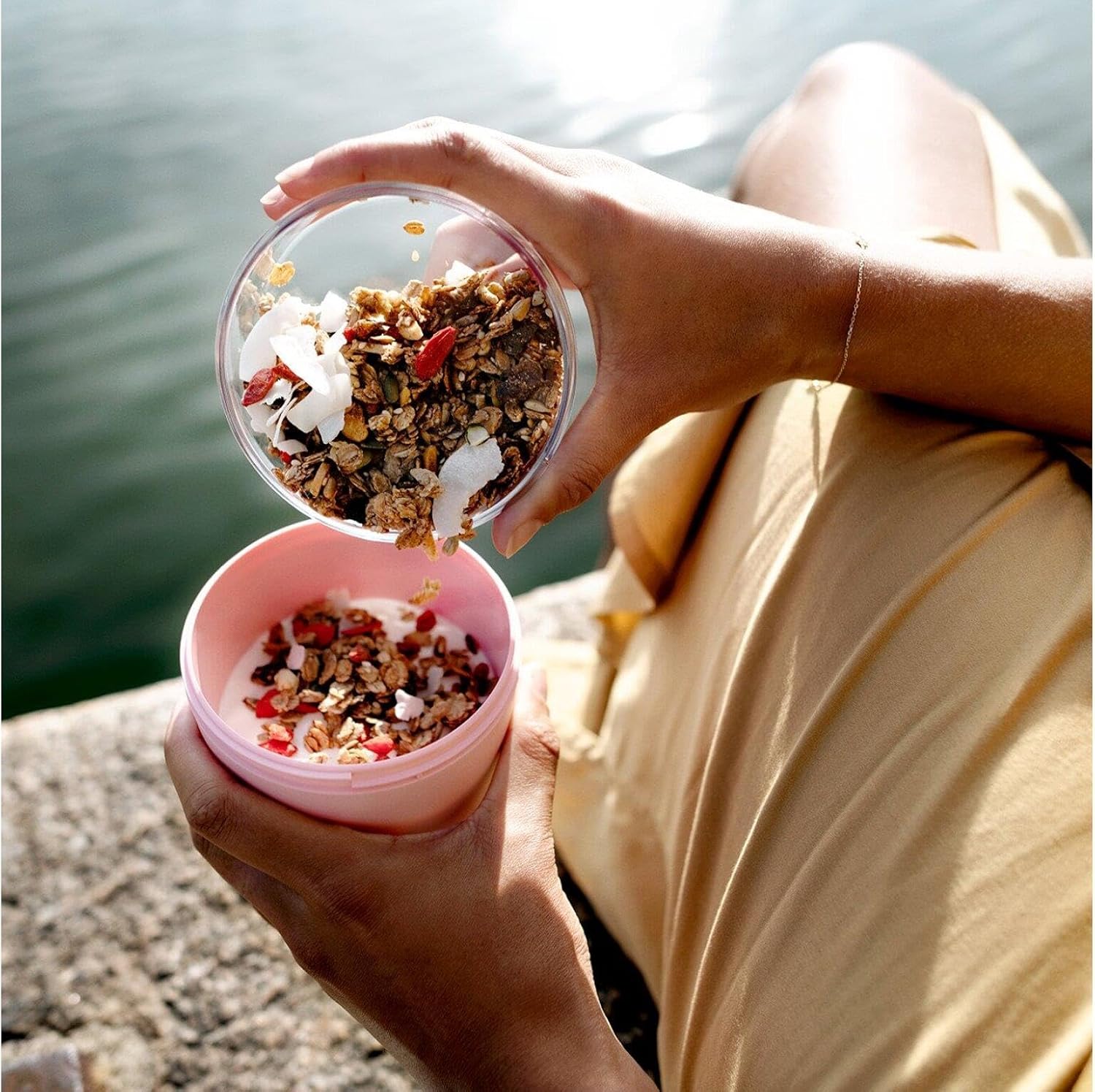 The Lunchpot Ellipse from Mepal is one handy product to carry your lunch or snack. The yoghurt cup has 2 different compartments, making it possible to keep the different ingredients separated. For example yoghurt and muesli or soup and croutons. The dry ingredients can be placed in the top compartment, keeping them crispy. Each Container has it's own lid, the two can be joined or separated with a simple twist. Moreover, the lids fit both Containers, so you don't have to look for the right lid in the morning. The capacity of the upper transparent Container is 200 ml, which means it can hold about 75 grams of muesli or fruit. The capacity of the lower Container is 500 ml, enough for a generous portion of soup, noodles or yoghurt. The lunch pot is made of durable material and can be used in the freezer, microwave (do remove the lid) and dishwasher. The top transparent Container should not be used in the microwave.