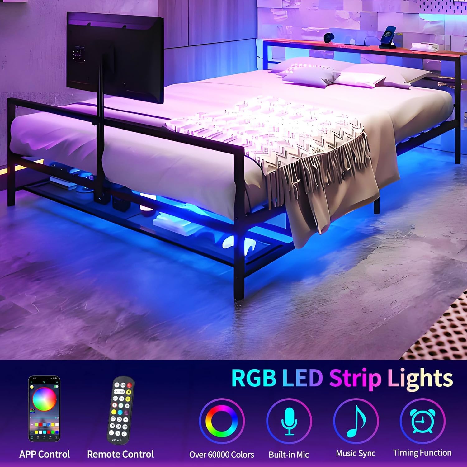 The ultimate full-size gaming bed frame features a smart LED headboard, a 360° rotating TV mount, a built-in charging station, and maximized storage with a desk, all built on a durable metal platform for an immersive, organized, and tech-savvy bedroom experience.