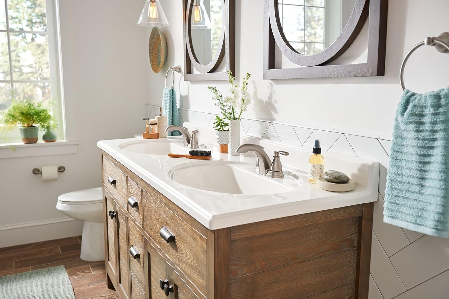 Moen 84532 Features: Covered under Moen's limited and a 5 year limited commercial Faucet body constructed of metal Coordinates with products from the Hilliard line Centerset installation - 3 hole one-piece faucet with 4" centers Dual lever handles control the flow and temperature of water Pop-up drain assembly included ADA compliant compliant Moen 84532 Specifications: Height: 4-7/8" (deck to top of faucet) Spout Height: 3-5/8" (deck to spout outlet) Spout Reach: 4-11/16" (faucet base to spout outlet) Flow Rate: 1.2 gallons-per-minute Faucet Centers: 4" (distance between centers of outside faucet holes) Maximum Deck Thickness: 1-3/16" (cannot mount on thicker decks) Hole Size: 1" Faucet Holes: 3 (minimum number of holes required for installation)