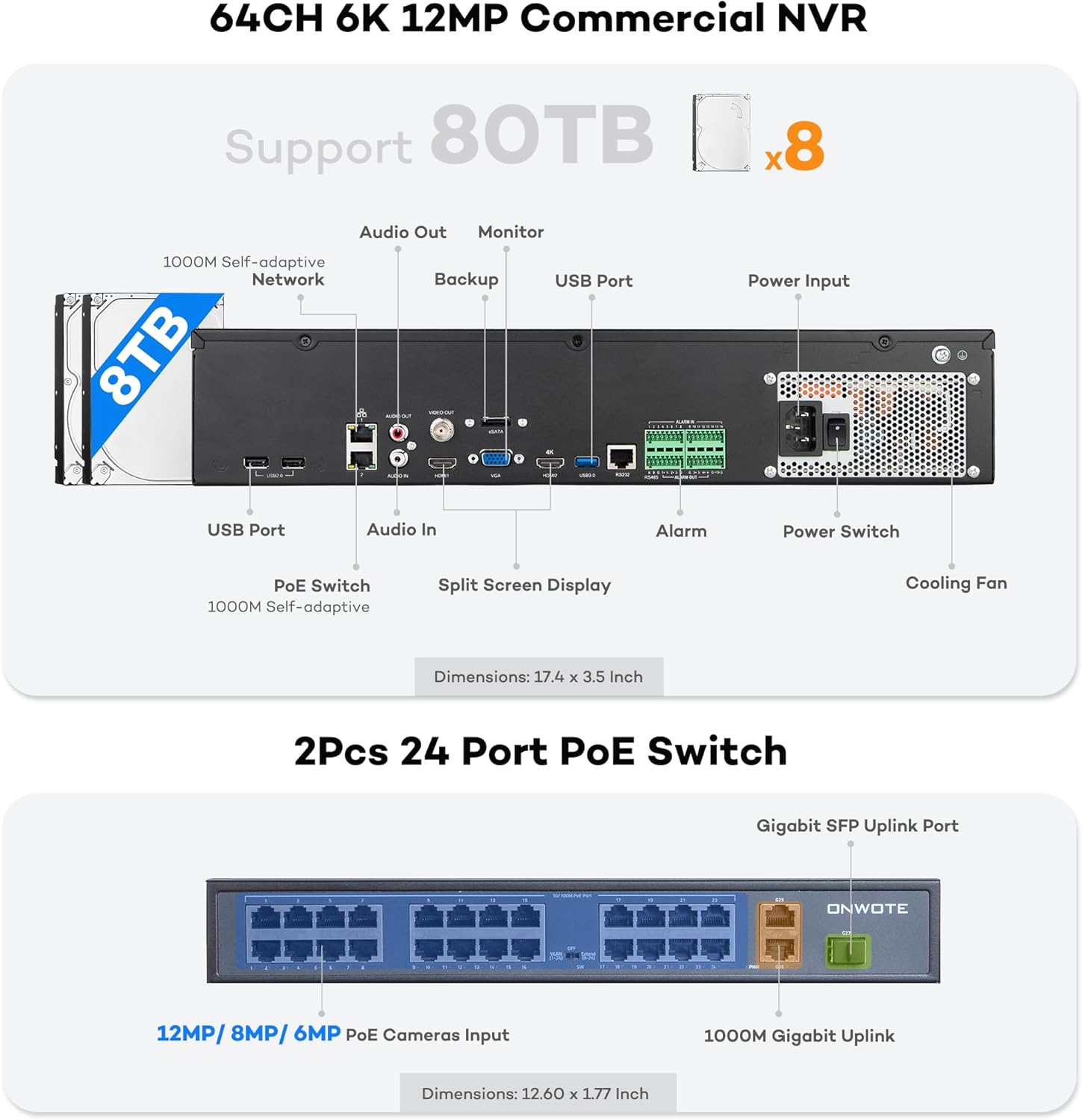| BuiltIn Media | 1 Pcs 64CH 6K 12MP NVR, 2 Pcs 24 Ports PoE Switch, 2 Pcs 8TB Hard Drive Pre-installed, 48 Pcs 6MP PoE IP Security Cameras, 48 Pcs Screw Pack & Cable Waterproof Lid |