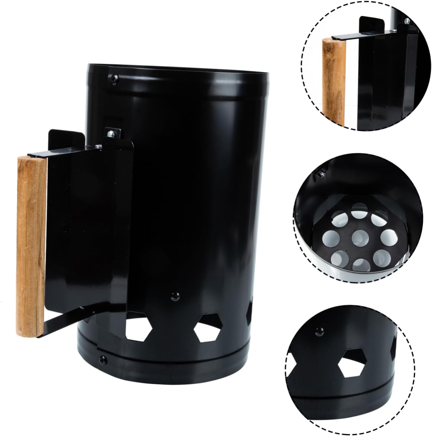 Package List 1 x BBQ Ignition Barrel Features -Color: Black BBQ Tool -Size: About 27.50X17.00X17.00cm/10.81X6.68X6.68in Chimney Starter -Material: Metal, wood Charcoal Burning Barrel -Multiple air holes to ensure air flow, make the charcoal quickly ignited Barbecue Fire Starter. -High temperature resistance, safety and scald prevention, quick charcoal point Fire Starter. -Safe, no , no peculiar smell to food, tool is faster than the commonly used square starter Camping Tool. -The chimney starter is practical and -proof, and has a . The wood handle is designed to burns BBQ Ignition Barrel. -Large open mouth make it convenient to quickly pour the charcoal out Burning Carbon Barrel.Goods InformationOutdoor Barbecue Tool This charcoal chimney starter is constructed with metal and wood.charcoal chimney starter Large diameter holes at the base for lighting your lighter fluid or newspapers to start the charcoal.Charcoal Burning Barrel The generous ventilation holes on charcoal chimney can canister will ensure the charcoal have excellent air circulation and heat generation