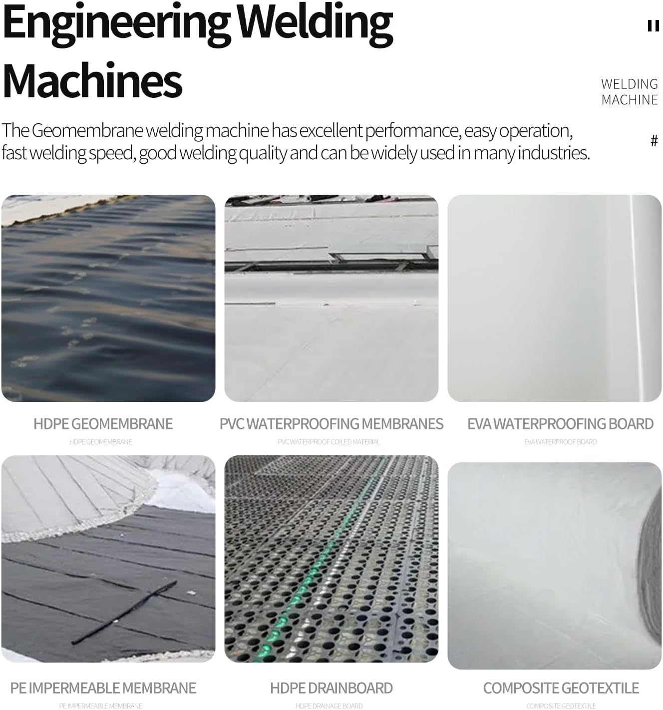 The ZC series geomembrane welding machine is suitable for PE, PVC, EVA, HDPE, PP and other all soluble materials welding, widely used in tunnel, railway, water conservancy, landfill, undersea tunnel, high-speed rail, aquaculture, building waterproof and other engineering construction.