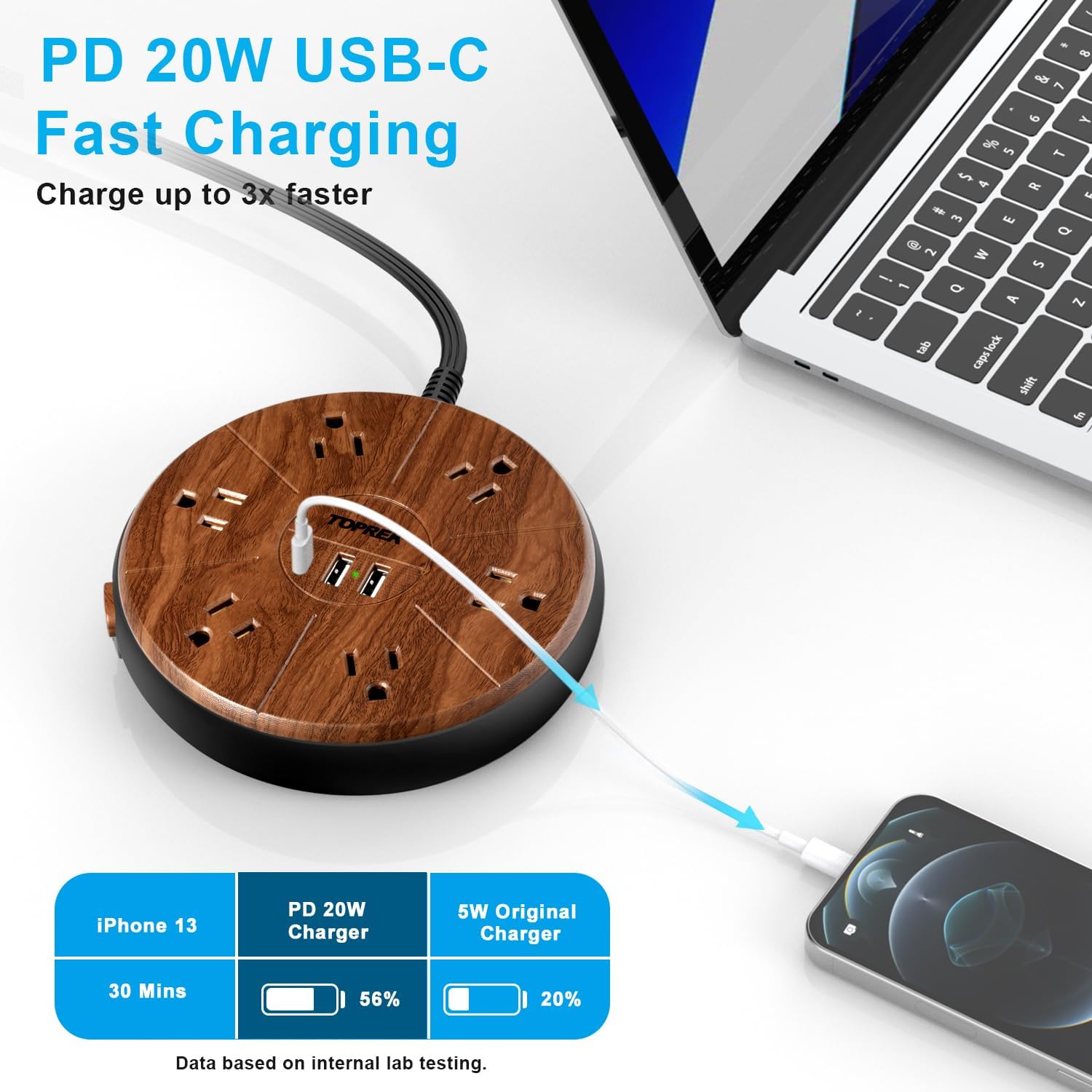 Power Strip with USB, PD 20W USB-C Charging, 6.5 FT Extension Cord with 6 Outlets, 1 USB-C, 2 USB-A, TOPREK Power Strip Surge Protector, Wood Finish Desk Charging Station for Home, Office, Dorm