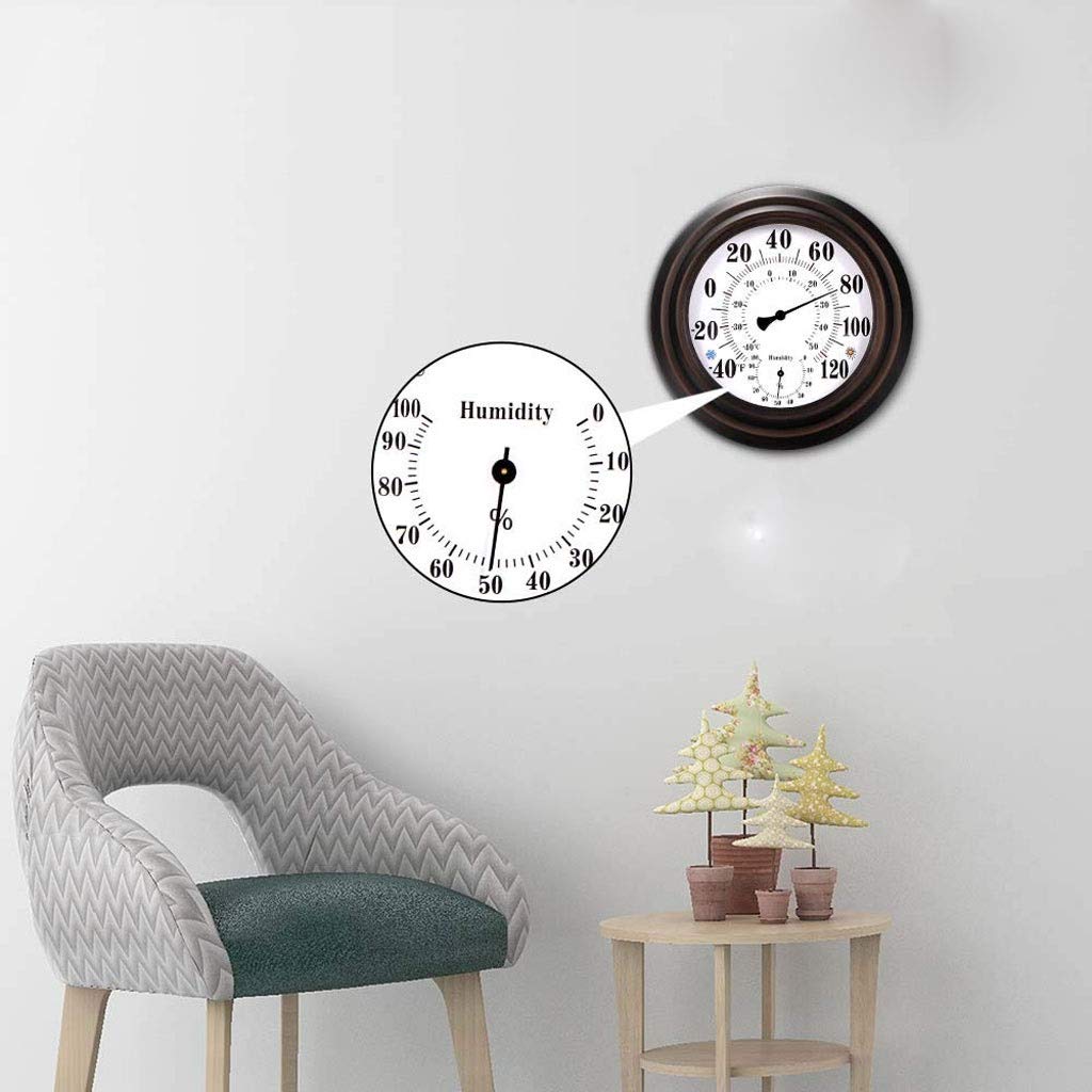 SpecificationType: round wall thermometerQuantity: 1pcMaterial: plating iron + plastic + glass +PVC dialColor: brownMeasuring range: temperature -40 ~ 120F (-40 ~ 50C), humidity 0 ~ RelAccuracy: Temperature +/-5F (+/- 2C), humidity +/- 7% (40% to 70% Rel)Size: 20.3*4.3cmNet weight: 524.5g/ 18.5ozPackage:1* round wall thermometer1* package box