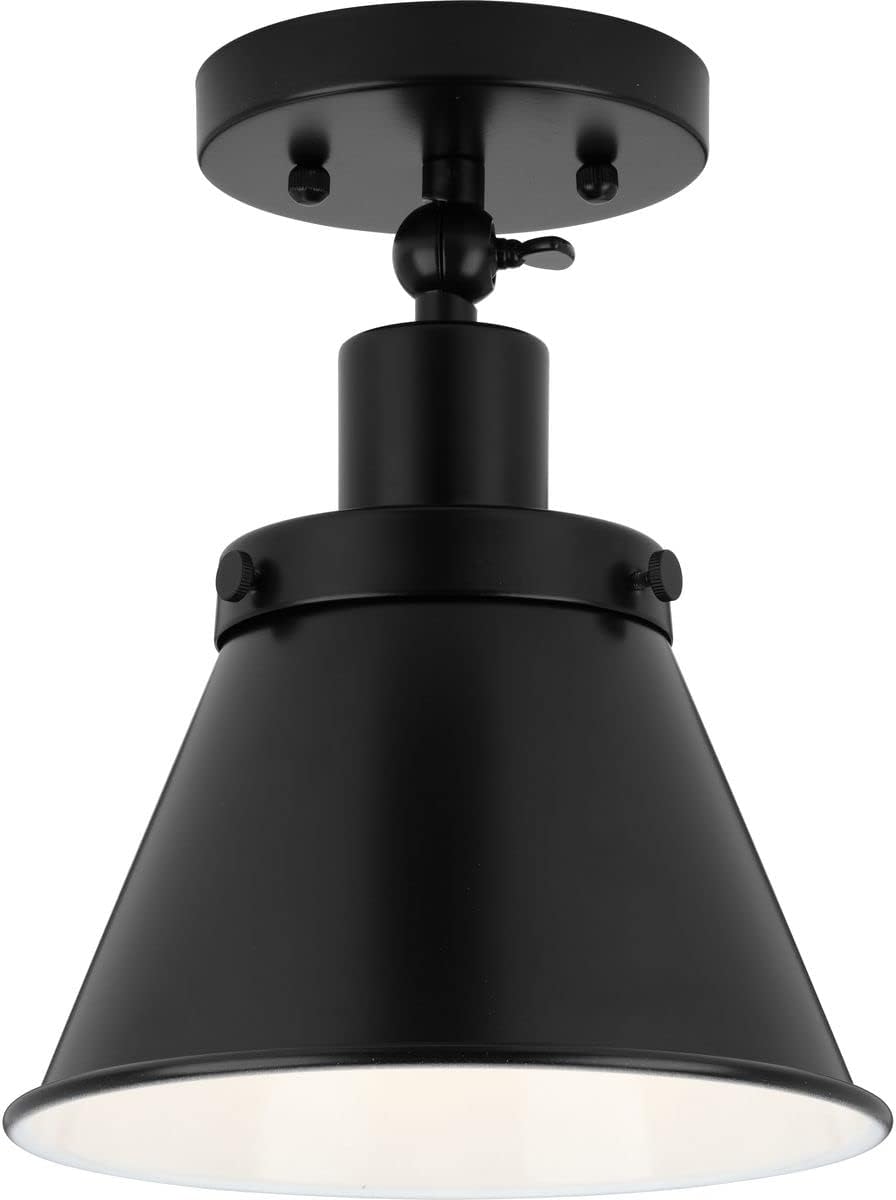 Embrace stylish simplicity with the Hinton Collection 1-Light Matte Black Vintage Semi-Flush Mount Ceiling Light. The circular ceiling plate and industrial light base are coated in a classic matte black finish. A light source glows from inside a metal shade that provides effective task lighting wherever focused illumination is called upon. For ideal illumination, use 1 medium base bulb that is sold separately (60w max - LED/CFL/incandescent). The overhead light is compatible with dimmable bulbs. The semi-flush mount's stylishly simple design is ideal for any hallway, stairwell, entryway, closet, or sitting room in farmhouse, transitional, and vintage electric style settings. It's time to breathe new life into the mundane every day with timeless and truly transformative lighting. Make your purchase today to begin your journey to a whole new lighting experience. Progress Lighting products are designed for exceptional quality, reliability, and functionality.