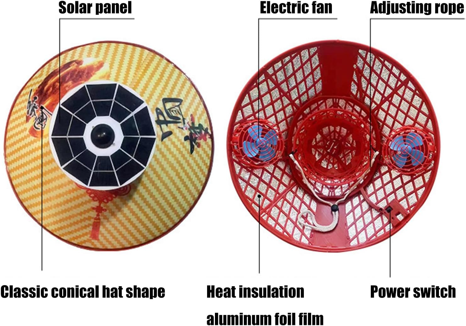 Rechargeable Solar Sun Hat Rainproof Wide Brimmed Built In Fan Outdoor Hat For Fishing Farming ActivitiesFeatures:Stay protected and cool with our Solar Powered Sun Hat featuring built in ventilation fans, wide brimmed, and rainproof polyester for outdoor comfort.The hat's innovative design combines a lightweight conical shape with adjustable chin straps and breathable fabric, ideal for prolonged wear in sunny conditions.Perfect for farmers, fishermen, and construction workers needing sun protections during extended outdoor activities.Essential for fishing trip, agricultural work where weather resistance and cooling features matter most.Upgrade your outdoor gears with this versatile hat that merges traditional styles with modern solar technology for comfort.Specifications:Component: Polyester Size: Approx.45x45x19cm/17.72x17.72x7.48inchColor: 3 Option Quantity: 1 PcPackage Includes:1x Chinese Farmer HatNote:1.Please allow 1-2cm errors due to manual measurement, note that you do not mind before you order. 2.Due to the differences between different monitors, the picture may not reflect the actual color of the item.
