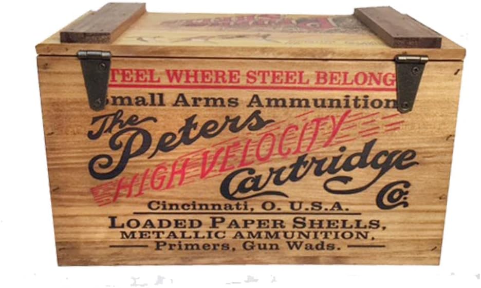Hand crafted Remington Peters wooden storage box. This box is individually crafted from pine and finished in a warm brown stain. Features a hinged top. The front and ends are emboss printed with the original Remington printing plates. The lid is sublimated printed with Remington graphics art. Overall dimensions 14-3/4" x 8-1/4" x 9". Made in the U.S.A.