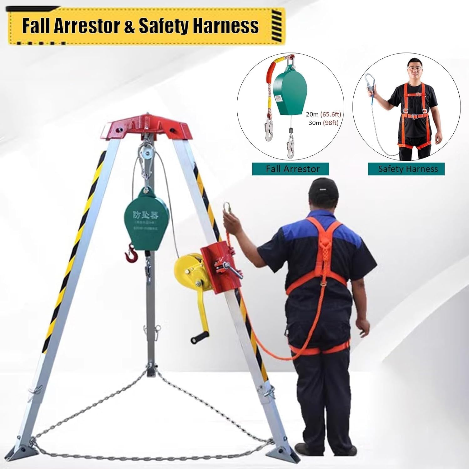 Introducing our Emergency Firefighting Rescue Rope System, expertly designed for safety and efficiency in critical situations. Crafted from high-strength lightweight aluminum alloy, this system combines durability with portability, making it an essential tool for firefighters, rescue teams, and industrial applins. Our winch system offers multiple options to meet your needs, with capacities ranging from 1200LBS to 2600LBS, ensuring that you have the right tool for any emergency scenario. The wire cable lengths vary from 20m to 30m, providing ample reach for diverse rescue operations. With a safe load capacity that supports up to 660LBS, you can trust this system to handle heavy-duty tasks with ease. The innovative pulley system positions the wire rope cable directly over the tripod's center point, promoting superior balance for operators during use. The winch features a robust steel housing, designed to withstand harsh working conditions, ensuring high performance when you need it most. Safety is paramount, and our tripod kit includes three protection chains that enhance support for demanding confined space applins. The adjustable, non-skid feet are equipped with yellow and black reflective strips, providing visibility and caution for bystanders during operation. Ease of use is key; our tripod can be quickly set up and dismantled without the need for tools, allowing for swift deployment in emergencies. This kit includes everything you need\u2014winch, steel cable, and safety belt\u2014making it a comprehensive solution for your rescue needs. Whether you are in firefighting, construction, or any field that requires reliable rescue equipment, our Emergency Firefighting Rescue Rope System is engineered for performance and safety. Equip yourself with a product that values quality and efficiency, and be prepared for any situation.