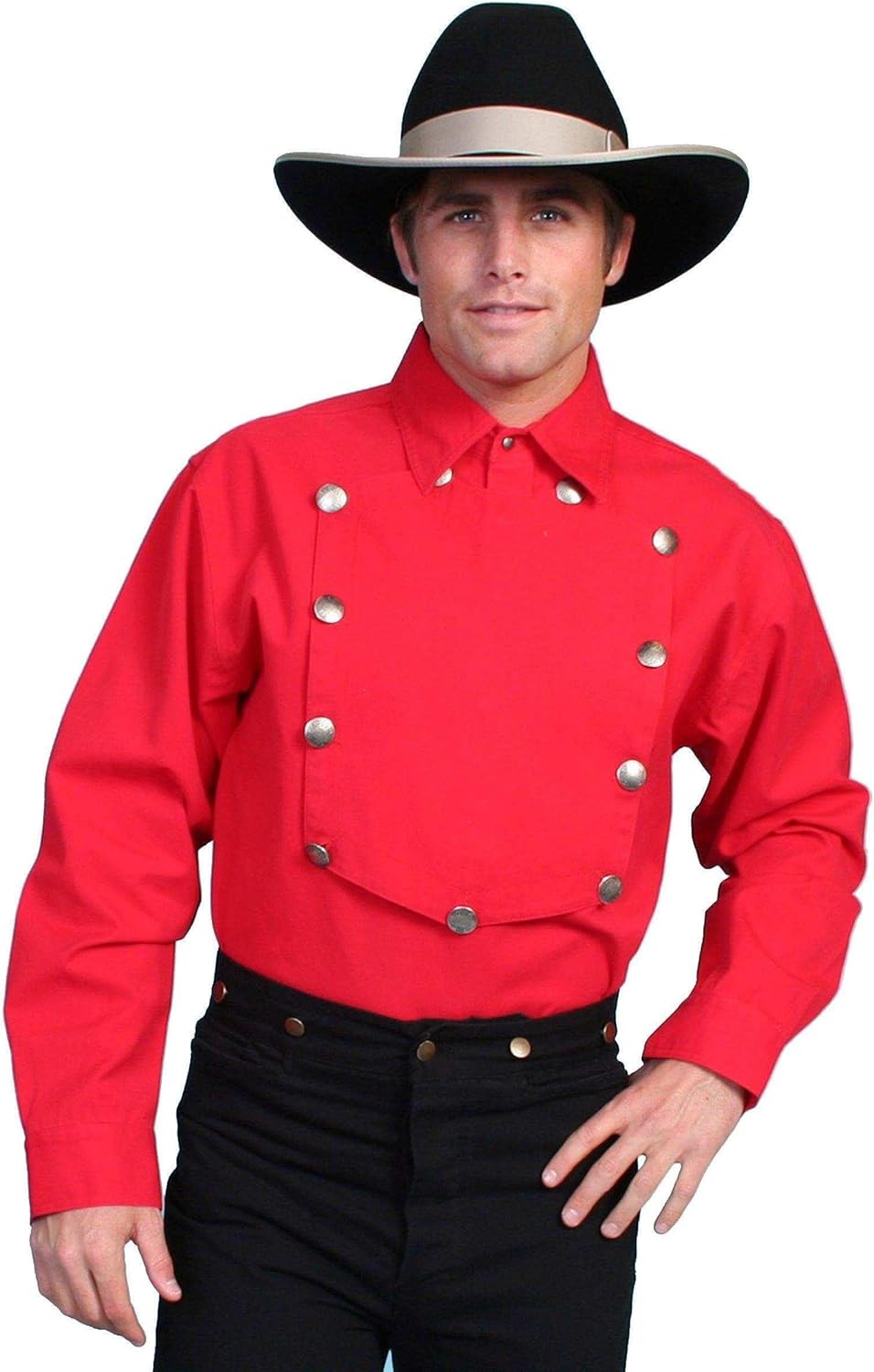 This Rangewear by Scully shirt has a great authentic Old West look. Rangewear is a part of the Old West Collection by Scully. Men's shirt features a front button-on bib. Shirt has pullover styling and four-button placket underneath bib. Large silver-tone bib buttons. Matching small buttons on shirt front and cuffs. Straight back yoke. Extended tails. Made of heavyweight 100% cotton. Imported.