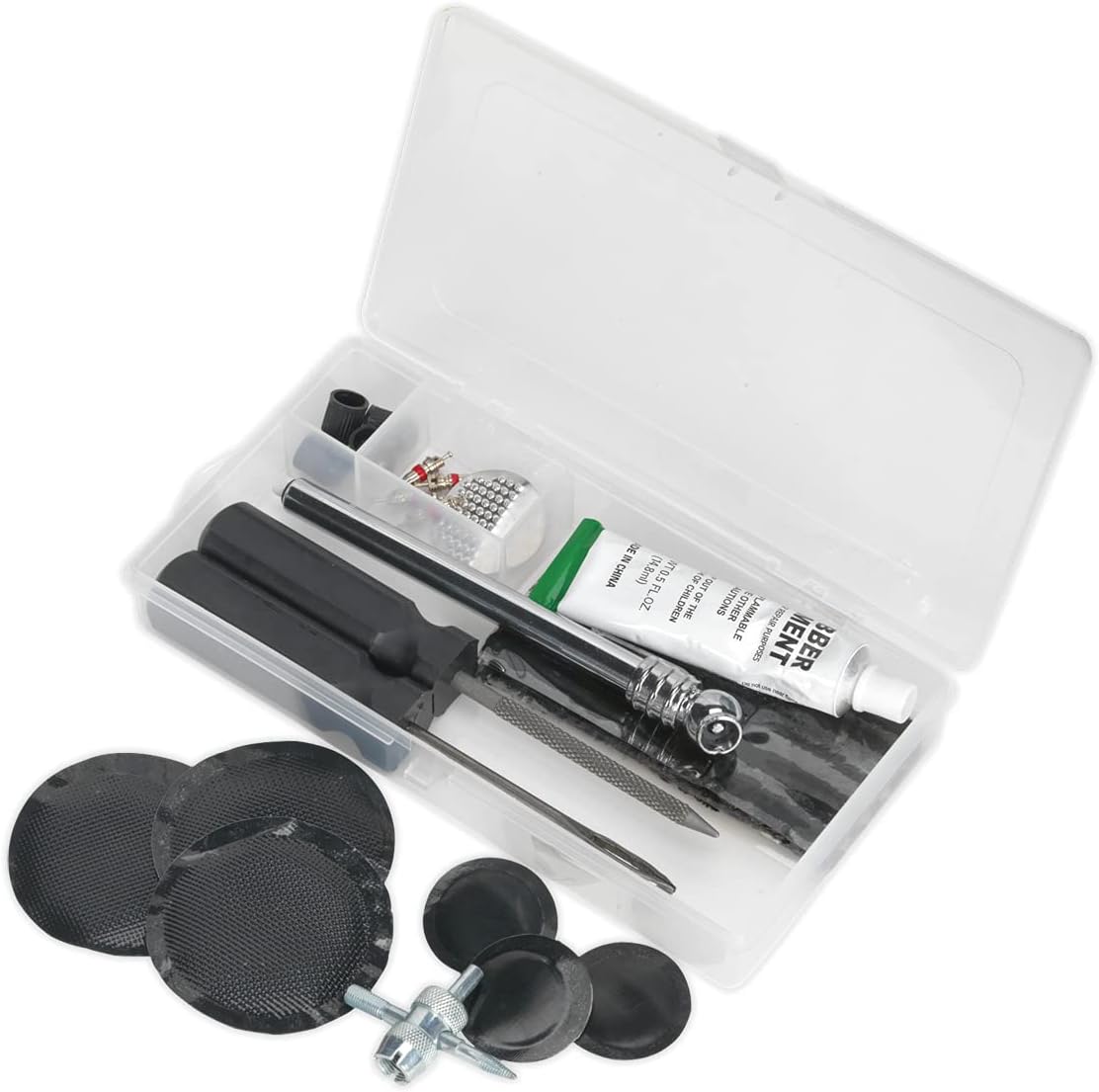 Temporary Puncture Repair & Service Kit. Sealey part No. TST09. - Ideal for repairing punctures on tubed and tubeless tyres fitted to agricultural and off road vehicles. - Can also be used as a temporary/emergency fix on cars and commercial vehicles. - Repair strips allow tubeless tyres to be repaired without removing the tyre from the wheel. - Also includes parts and tools for general tyre servicing. - Not to be used as a permanent repair for road vehicles.