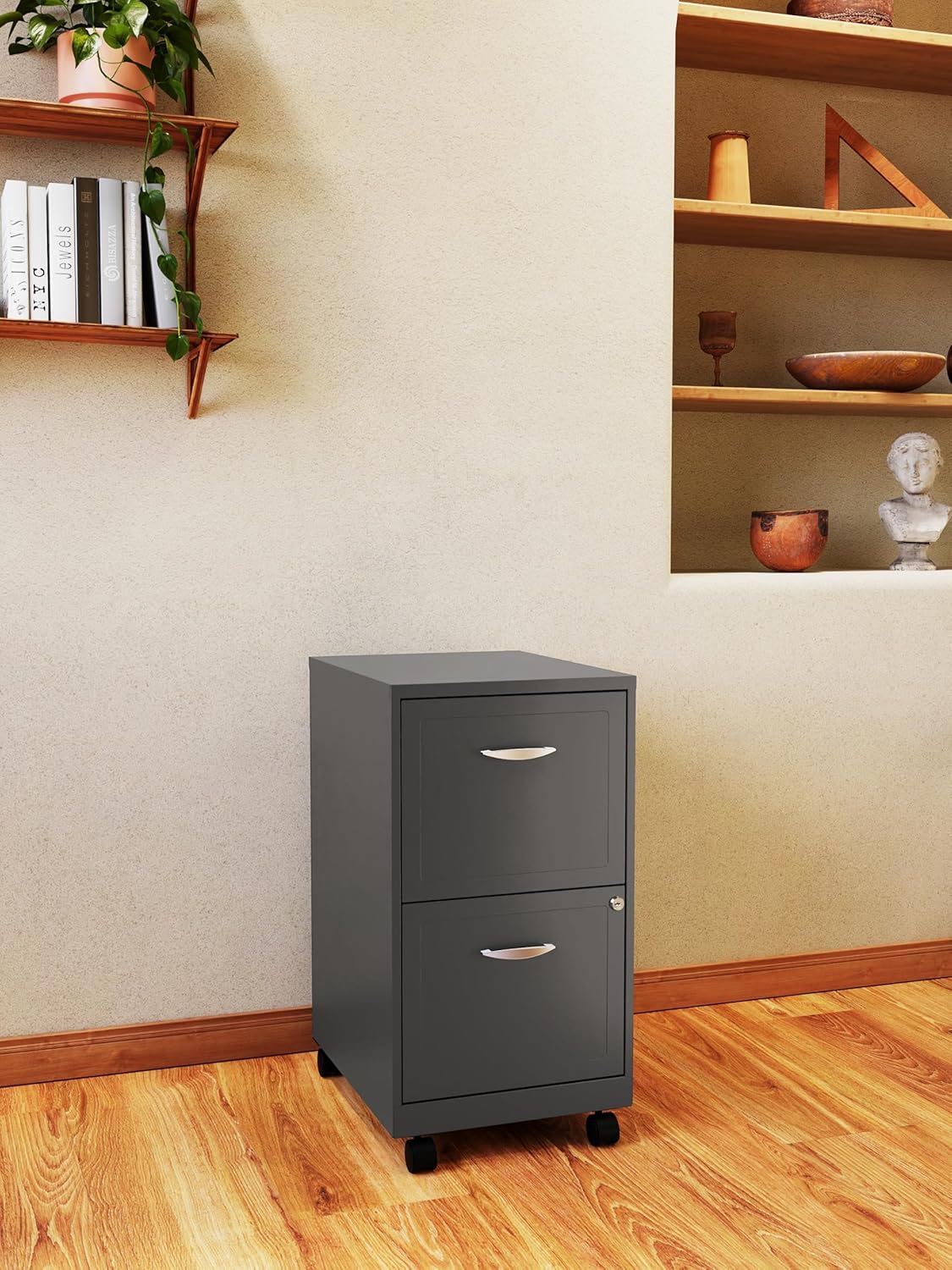 Have you been looking for an effective solution to streamline your office organization while adding a touch of elegance? Holding all your important documents, the Space Solutions 2-Drawer Mobile File Cabinet gives you some peace of mind by securing your sensitive files. Compact and designed for smaller office spaces, the cabinet is sure to fit in your home office, ideal for home file organization. Ample storage space and patented glide suspension make for easy storage and transportation of documents. The 4 rolling wheels let you maneuver the files wherever they're needed with ease. A built-in cam lock secures the 2 top drawers, ensuring your sensitive documents are safe from prying eyes. Each drawer opens to 3 quarters of its full length for easy access to the interior. Built with 2 large drawers, the cabinet holds letter-sized hanging files, efficiently organizing tax and legal documents, paperwork, and other items. The black finish exudes sophistication and complements a range of office aesthetics, from contemporary to traditional. Crafted with durability in mind, this cabinet is built to withstand the rigors of daily use, promising years of dependable service. Suited for home offices and smaller business spaces, secure and store all your sensitive documents in the Space Solutions 2 Drawer Mobile File Cabinet and experience the ideal blend of functionality and style for your office.
